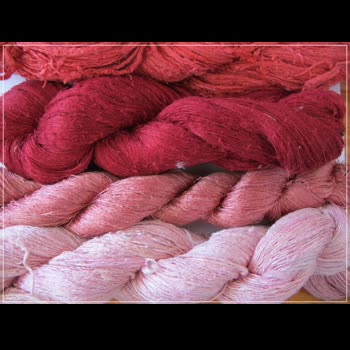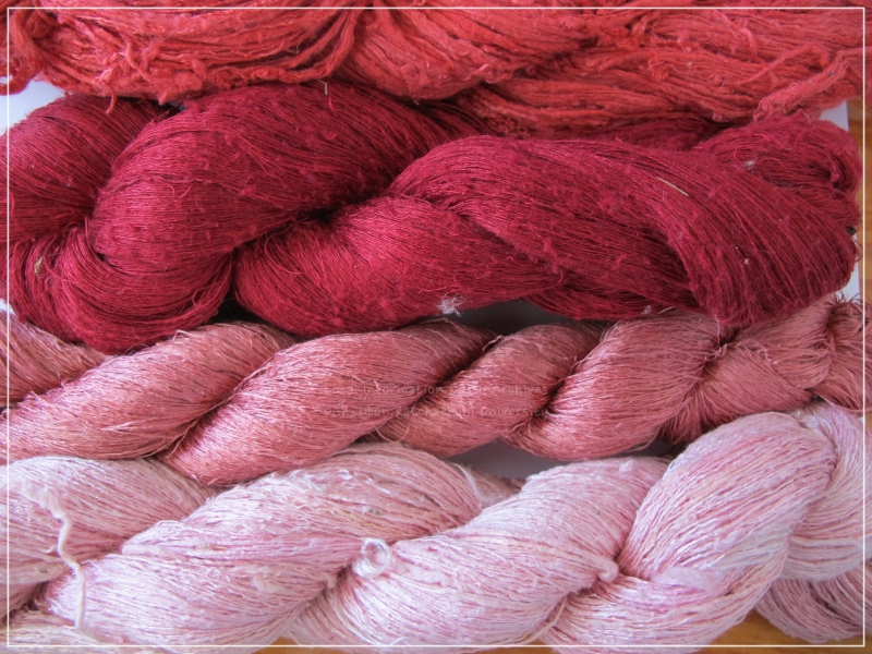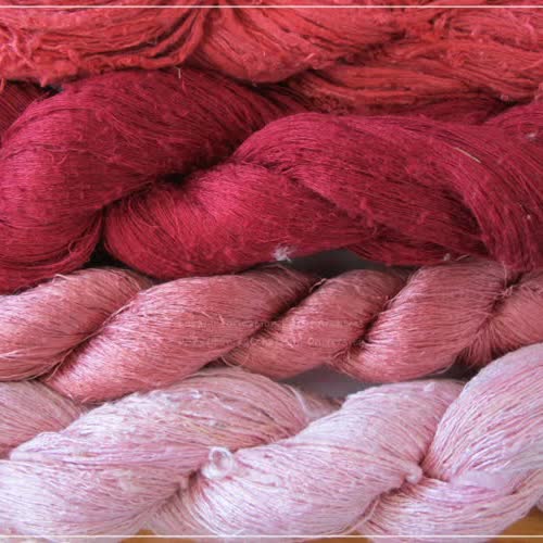 | คำอธิบาย : เส้นไหมที่ย้อมด้วยครั่ง จะให้เส้นไหมโทนสีชมพู สีแดง ความอ่อนแก่ของสีขึ้นอยู่กับจำนวนครั้งหรือความเข้มข้นในการย้อมครั่ง คือ ยางหรือชันชนิดหนึ่ง ซึ่งเป็นสารที่ขับถ่ายออกจากตัวแมลงครั่งที่จะอาศัยอยู่ตามกิ่งไม้ แมลงครั่งจะใช้ปากดูดเจาะเข้าไปในกิ่งของต้นไม้เพื่อดูดน้ำเลี้ยงมาเป็นอาหารและขับถ่ายครั่งออกมาตลอดเวลาเพื่อห่อหุ้มตัวเป็นเกราะป้องกันอันตรายจากสิ่งภายนอก ขี้ครั่งมีลักษณะนิ่มเหนียวสีเหลืองทอง เมื่อถูกอากาศนานเข้าจะแข็งและมีสีน้ำตาล ครั่งที่เก็บได้จากต้นไม้เรียกว่าครั่งดิบ พืชที่ใช้เลี้ยงครั่ง เช่น จามจุรี พุทรา สะแกนา ปันแถ สีเสียดออสเตรเลีย |