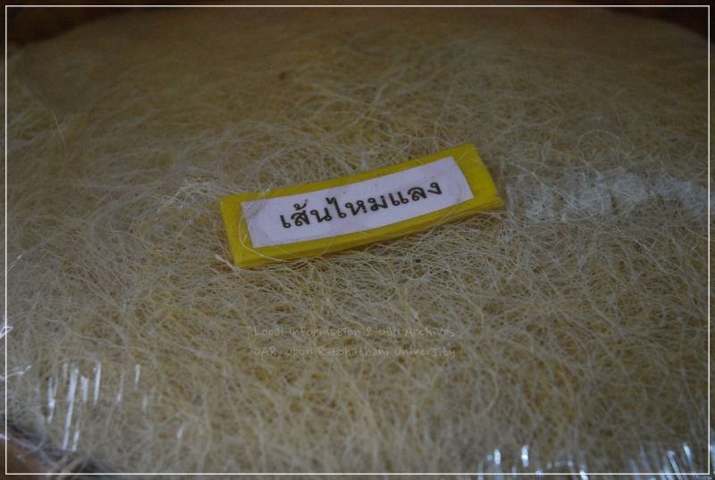 | คำอธิบาย : เส้นไหมแลง เป็นเส้นไหมที่อยู่เปลือกรังไหมชั้นในสุดจนเกือบจะถึงตัวดักแด้ เส้นไหมจะมีขนาดเล็ก ที่เรียกว่า ไหมแลง เนื่องจาก สมัยก่อนการสาวไหมนั้นชาวบ้านจะนิยมทำในตอนเช้า เมื่อสาวเอาไหมน้อยไปแล้ว แต่ยังเห็นว่าพอจะสาวเอาเส้นไหมออกจากรังไหมได้อีก ก็จะนำรังไหมนั้นมาต้มและสาวเอาเส้นไหมอีก ซึ่งมักจะเกิดขึ้นในช่วงเวลาเย็นหรือยามแลงของวันที่สาวแล้ว จึงเรียกว่า ไหมแลง |