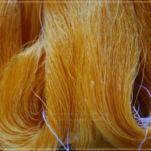 | คำอธิบาย : เส้นไหมน้อย หรือไหมเครือ หรือไหมยอด เป็นเส้นไหมที่ได้จากเปลือกรังไหมชั้นในหลังจากสาวเอาไหมหลืบหรือไหมเปลือกออกไปแล้ว การสาวเอาไหมน้อยนั้นจะต้องเปลี่ยนน้ำต้มก่อนจึงนำรังไหมลงต้ม เส้นไหมที่ได้จะมีลักษณะเส้นเรียบ ขนาดและสีสม่ำเสมอ รวมตัวได้กลมเกลี่ยง สะอาดไม่มีสิ่งปลอมปน นุ่มมือเมื่อสัมผัส นิยมใช้เป็นเส้นยืนในการทอผ้า เมื่อทอเป็นผืนผ้าแล้วเนื้อผ้าจะนุ่ม เรียบ มีความเลื่อมมันของเส้นไหมในระดับดีมาก มีความนุ่มนวลดี เส้นไหมมีความเหนียวสามารถนำมาทำเป็นเส้นยืนและเส้นพุ่งได้ ระดับความสม่ำเสมอของสีเส้นไหมดี สีเส้นไหมเป็นสีเหลืองทอง |