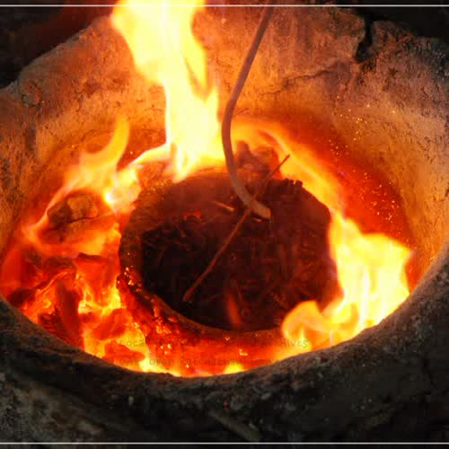 | คำอธิบาย : การหลอมทองเหลืองในงานหัตถกรรมทำเครื่องทองเหลืองบ้านปะอาว จังหวัดอุบลราชธานี เพื่อจะนำไปเทลงในแม่พิมพ์นั้น เริ่มจากการอุ่นเบ้าหลอมก่อน โดยวางเบ้าหลอมไว้บนเตาถ่านที่ให้ความร้อนสูง จากนั้นนำทองเหลือง หรือโลหะอื่น ๆ ที่ต้องการหลอมใส่ลงในเบ้าหลอม การหลอมจะใช้ความร้อนอุณหภูมิประมาณ 1100 องศาเซลเซียส ทองเหลืองและโลหะจึงจะหลอมละลายเป็นของเหลว |