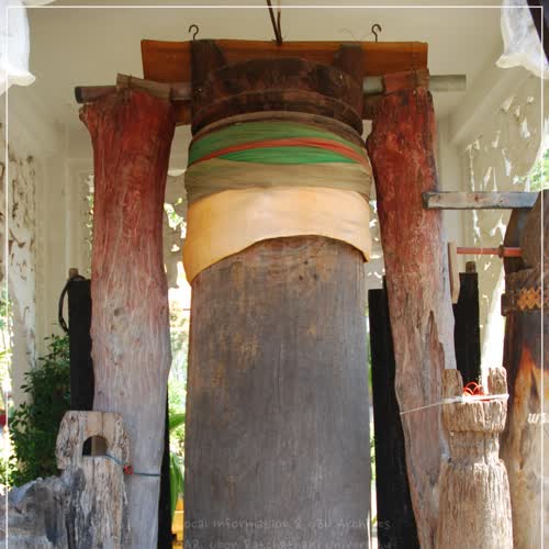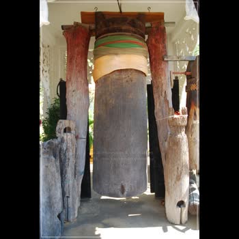 | คำอธิบาย : โปง หรือระฆังไม้ ที่พระสงฆ์จะใช้ตีเพื่อส่งสัญญาณต่าง ๆ ให้ชาวบ้านได้รับรู้ เช่น การรวมตัว การบอกเวลาหรือสัญญาณ มีลักษณะเป็นรูปทรงกระบอก ขุดด้านในให้กลวง เพื่อทำให้เกิดเสียง มักทำมาจากไม้แคน โปงขนาดใหญ่ก็จะมีเสียงทุ้มกว่าโปงขนาดเล็ก ปัจจุบันอาจจะมีการใช้น้อยลง เพราะปรับเปลี่ยนมาใช้ระฆังหรือกลองมากกว่า |