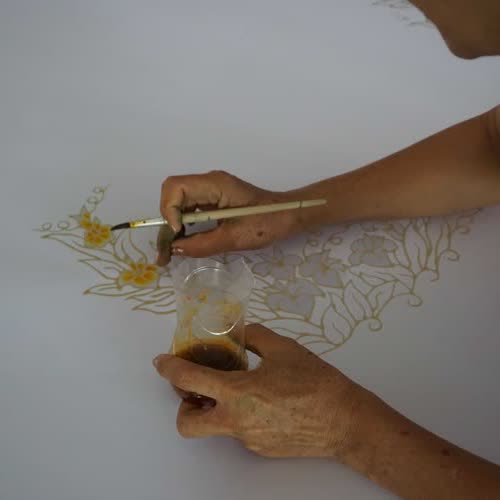 | คำอธิบาย : การทำผ้าบาติกของสมาชิกกลุ่มมัดย้อมสีธรรมชาติบ้านคีรีวง อ.ลานสกา จ.นครศรีธรรมราช โดยสีที่ได้และใช้มาจากธรรมชาติ เช่น เปลือกมังคุดที่ให้สีม่วง |