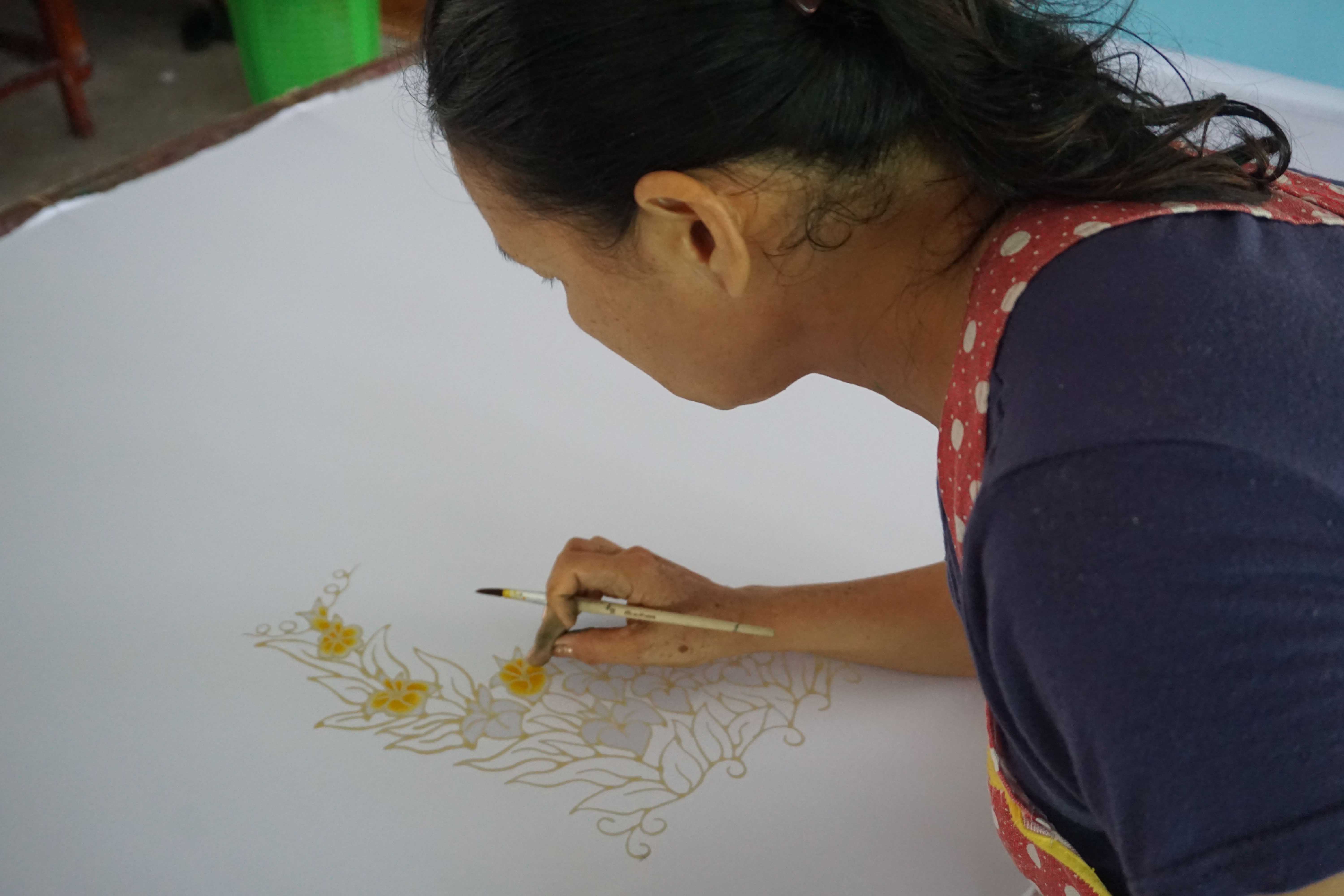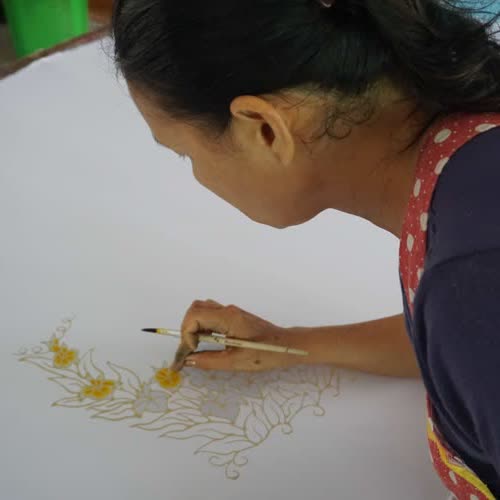 | คำอธิบาย : การทำผ้าบาติกของสมาชิกกลุ่มมัดย้อมสีธรรมชาติบ้านคีรีวง อ.ลานสกา จ.นครศรีธรรมราช โดยสีที่ได้และใช้มาจากธรรมชาติ เช่น เปลือกมังคุดที่ให้สีม่วง |