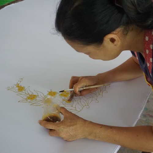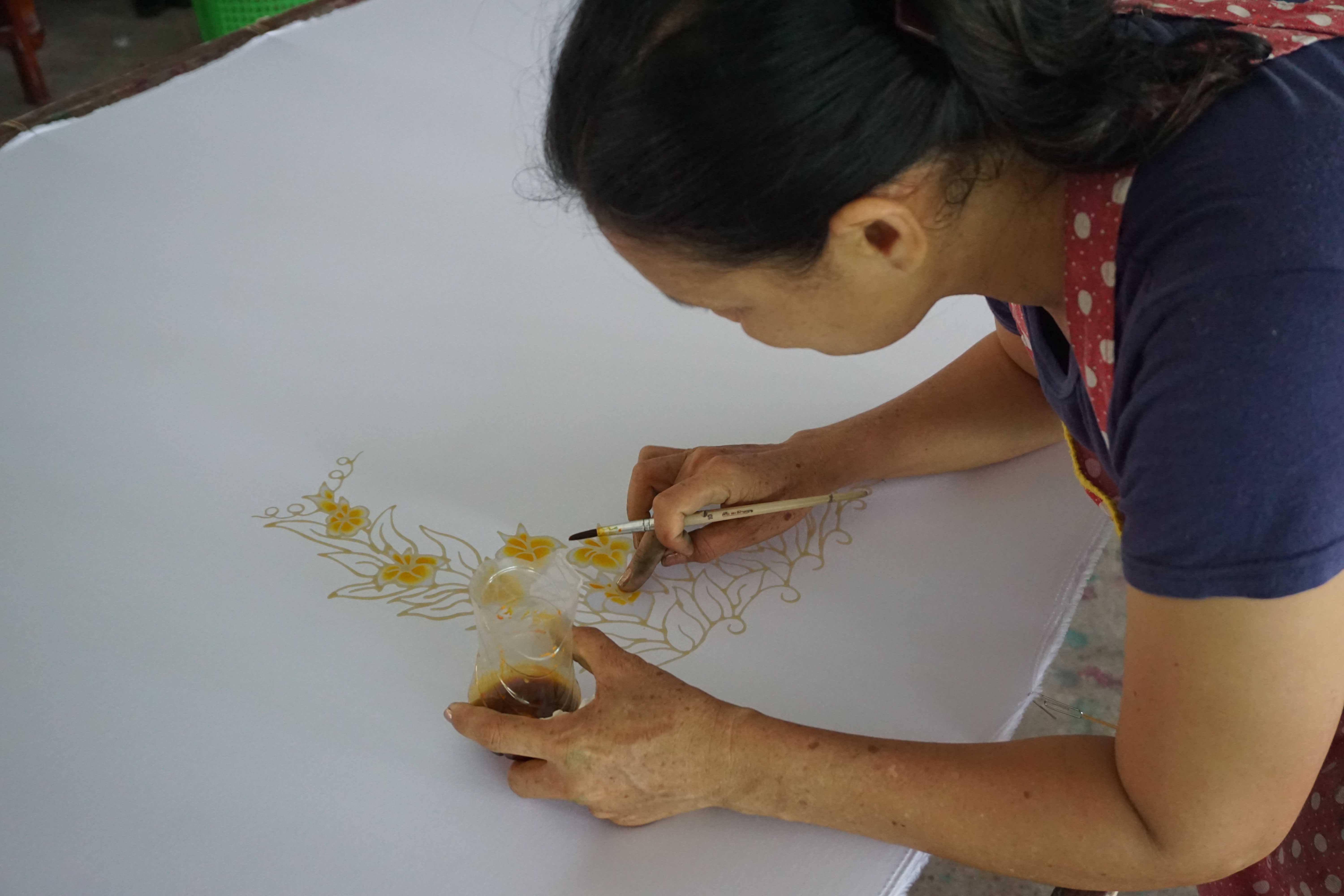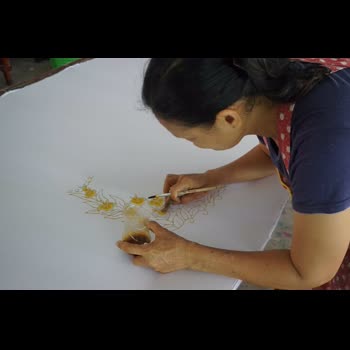 | คำอธิบาย : การทำผ้าบาติกของสมาชิกกลุ่มมัดย้อมสีธรรมชาติบ้านคีรีวง อ.ลานสกา จ.นครศรีธรรมราช โดยสีที่ได้และใช้มาจากธรรมชาติ เช่น เปลือกมังคุดที่ให้สีม่วง |