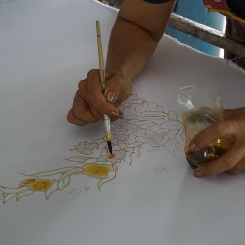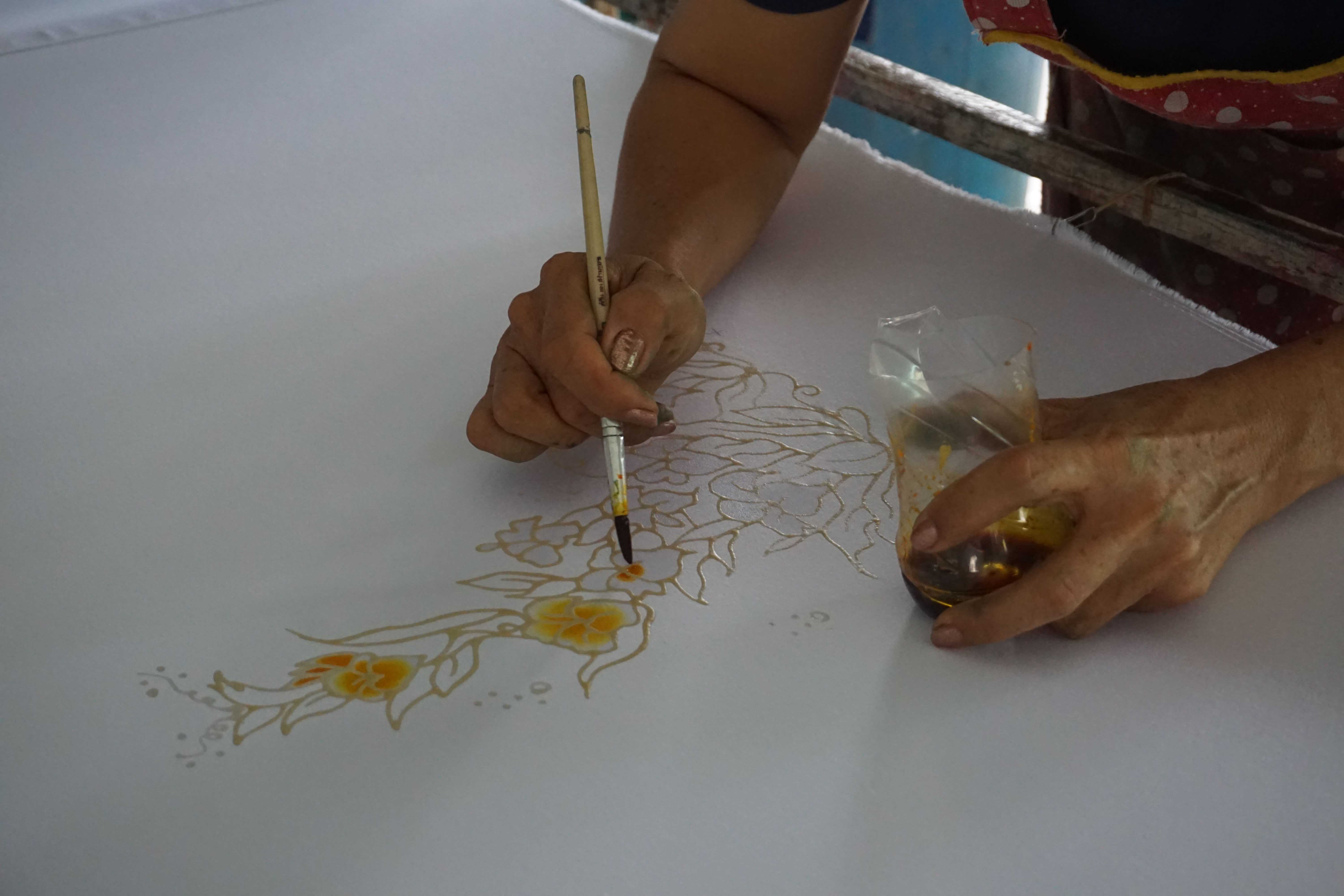 | คำอธิบาย : การทำผ้าบาติกของสมาชิกกลุ่มมัดย้อมสีธรรมชาติบ้านคีรีวง อ.ลานสกา จ.นครศรีธรรมราช โดยสีที่ได้และใช้มาจากธรรมชาติ เช่น เปลือกมังคุดที่ให้สีม่วง |