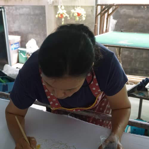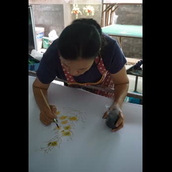 | คำอธิบาย : การทำผ้าบาติกของสมาชิกกลุ่มมัดย้อมสีธรรมชาติบ้านคีรีวง อ.ลานสกา จ.นครศรีธรรมราช โดยสีที่ได้และใช้มาจากธรรมชาติ เช่น เปลือกมังคุดที่ให้สีม่วง |