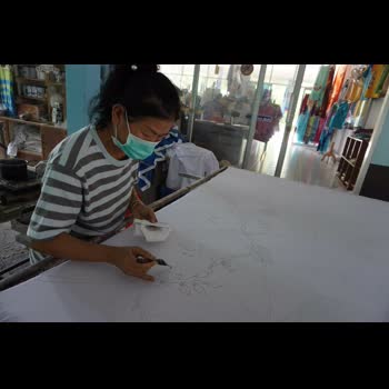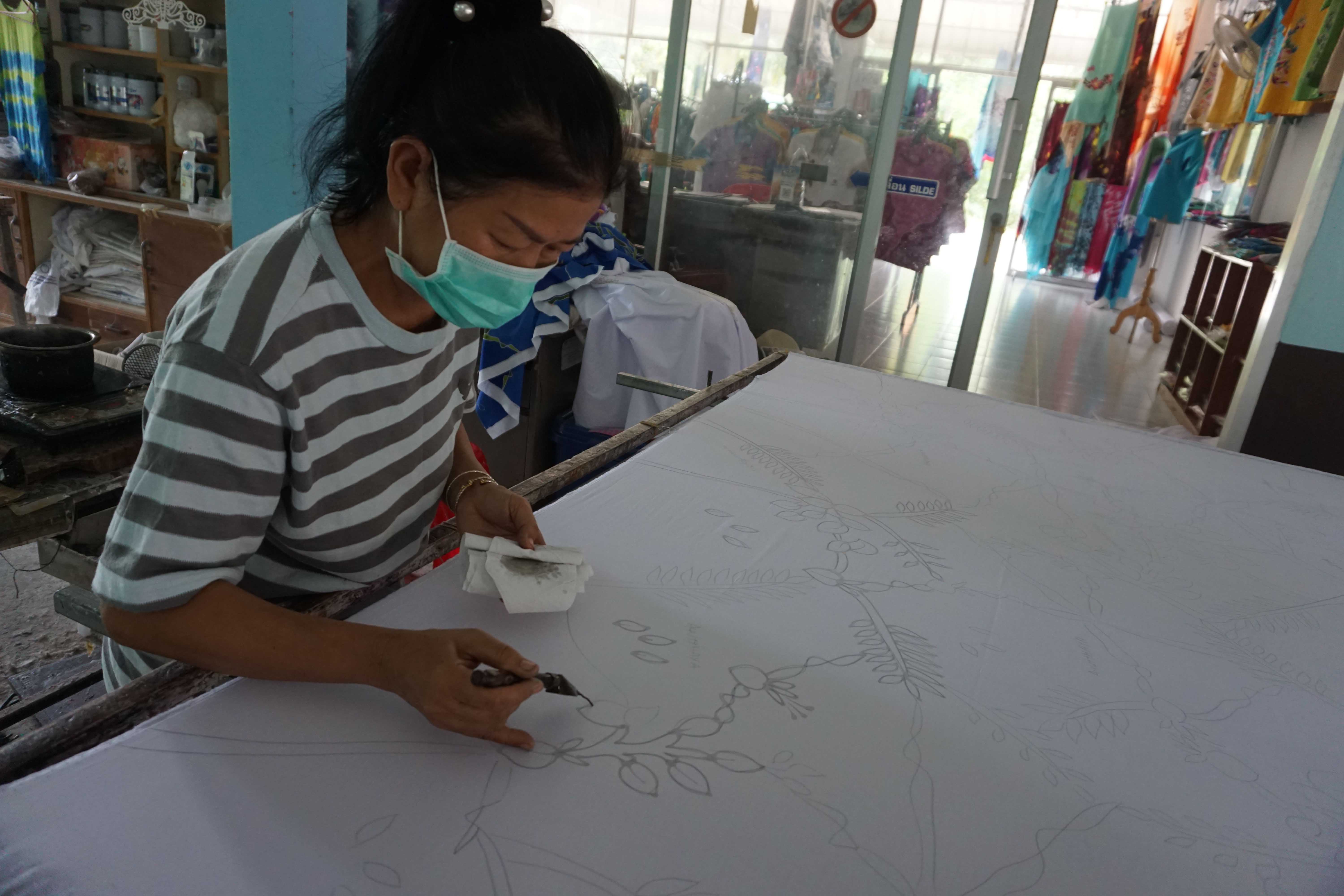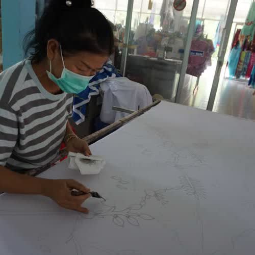 | คำอธิบาย : การทำผ้าบาติกของสมาชิกกลุ่มมัดย้อมสีธรรมชาติบ้านคีรีวง อ.ลานสกา จ.นครศรีธรรมราช โดยสีที่ได้และใช้มาจากธรรมชาติ เช่น เปลือกมังคุดที่ให้สีม่วง |