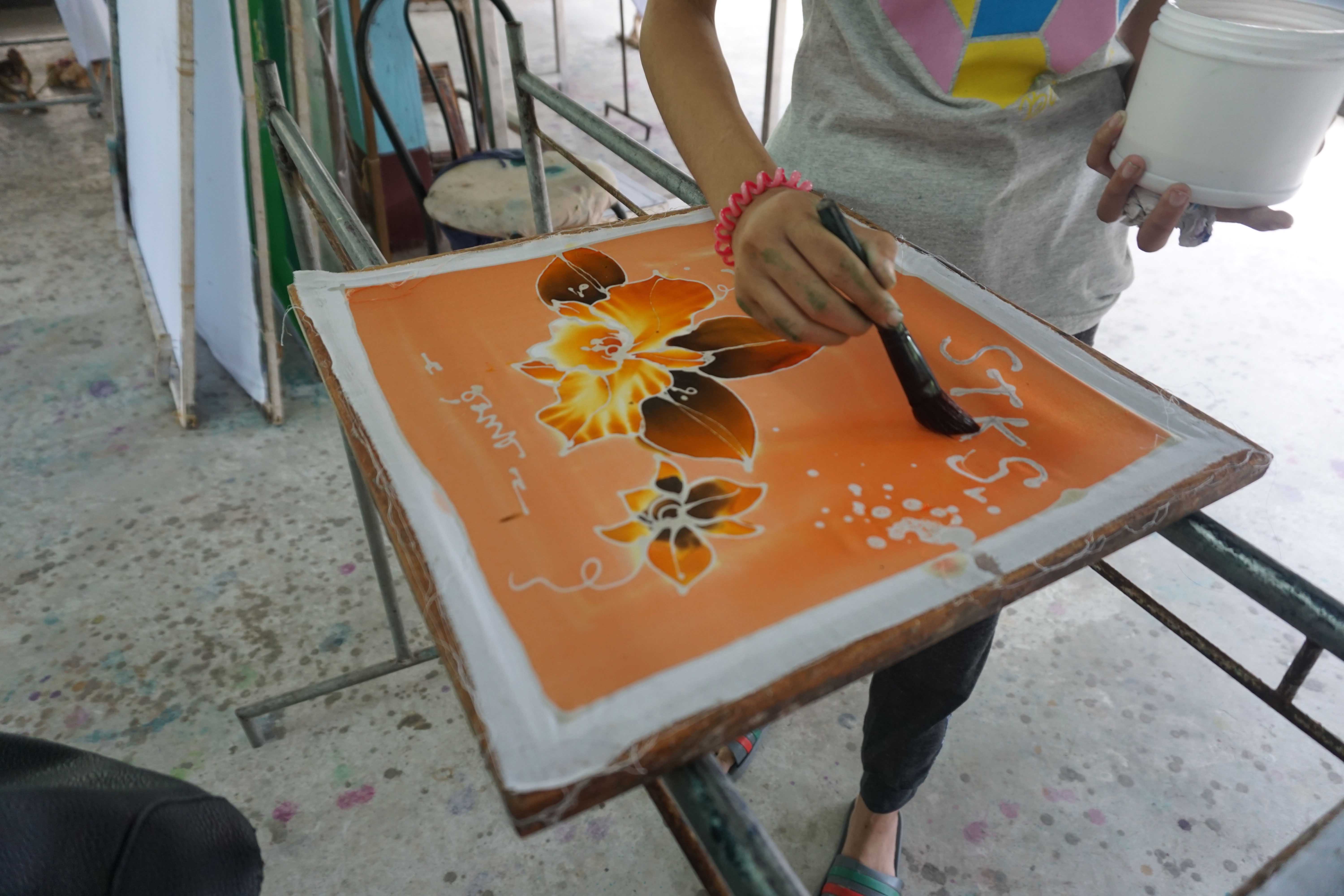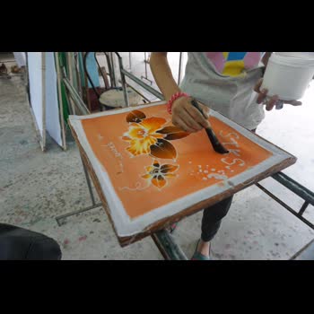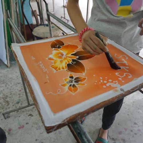 | คำอธิบาย : การทำผ้าบาติกของสมาชิกกลุ่มมัดย้อมสีธรรมชาติบ้านคีรีวง อ.ลานสกา จ.นครศรีธรรมราช โดยสีที่ได้และใช้มาจากธรรมชาติ เช่น เปลือกมังคุดที่ให้สีม่วง |