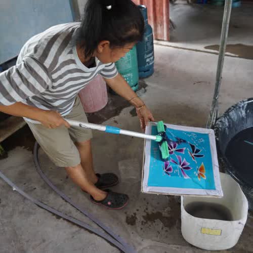 | คำอธิบาย : การทำผ้าบาติกของสมาชิกกลุ่มมัดย้อมสีธรรมชาติบ้านคีรีวง อ.ลานสกา จ.นครศรีธรรมราช โดยสีที่ได้และใช้มาจากธรรมชาติ เช่น เปลือกมังคุดที่ให้สีม่วง |