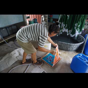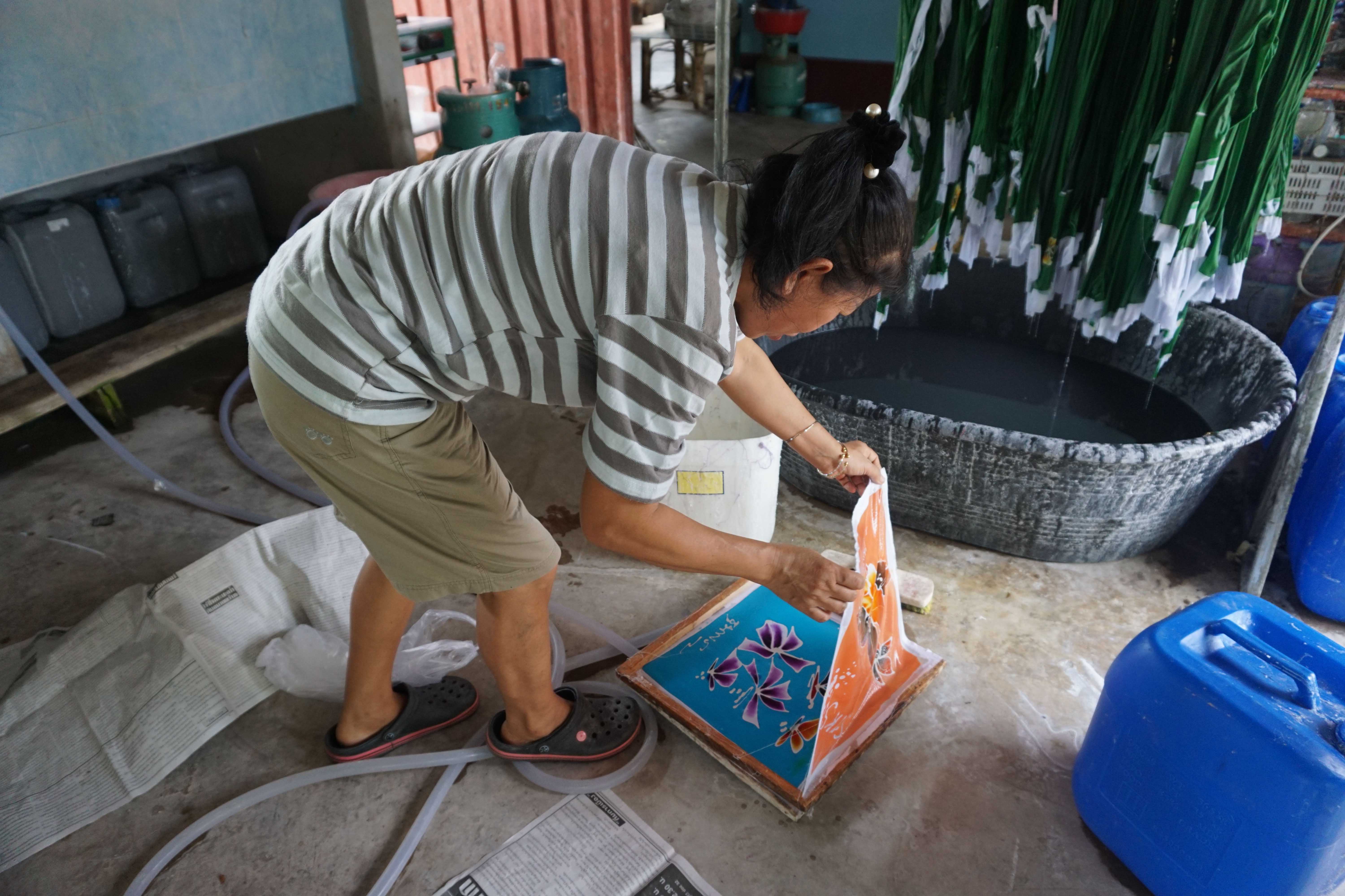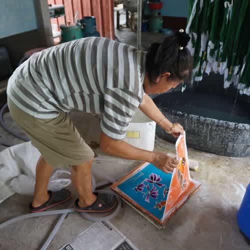| คำอธิบาย : การทำผ้าบาติกของสมาชิกกลุ่มมัดย้อมสีธรรมชาติบ้านคีรีวง อ.ลานสกา จ.นครศรีธรรมราช โดยสีที่ได้และใช้มาจากธรรมชาติ เช่น เปลือกมังคุดที่ให้สีม่วง |
