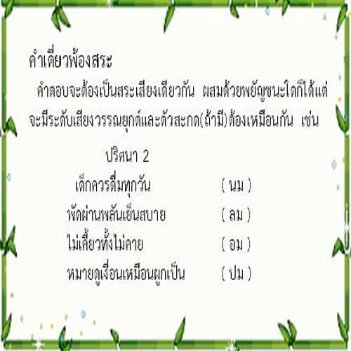 | คำอธิบาย : คำแนะนำ ปริศนาร้อยกรองจะมีรูปแบบคำตอบและมีหลักวิธีทาย ดังนี้ \\\*แต่ละบรรทัดมี 1 คำตอบ \\\*แต่ละ คำตอบ มีความพ้องสัมพันธ์กันรูปแบบใดรูป แบบหนึ่ง\\\*ในชุดคำตอบจะมีพยางค์คำตอบที่เท่ากัน (ยกเว้นประเภทคำผัน และคำตัดคำต่อ)\\\**คำใดที่เขียนอยู่ในปริศนาบรรทัดใด จะไม่นำมาเป็นคำตอบของบรรทัดนั้น |