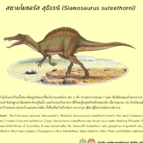 | คำอธิบาย : สยามโมซอรัส สุธีธรนิ เป็นไดโนเสาร์กินเนื้อขนาดใหญ่ชนิดแรกที่พบในประเทศไทย เดิน 2 เท้า ความยาวประมาณ 7 เมตร ฟันมีลักษณะเป็นทรงกรวย มีแนวร่อง และสันเรียง สลับตลอดคล้ายฟันของจระเข้ สันนิษฐานว่ามีแหล่งหากินอยู่ริมน้ำ และกินปลาเป็นอาหาร มีชีวิตอยู่ในยุคครีเทเชียสตอนต้น เมื่อประมาณ 130 ล้านปีมาแล้ว พบที่จังหวัดขอนแก่น กาฬสินธุ์ ชัยภูมิ อุบลราชธานี สกลนคร อุดรธานี และนครราชสีมา ตั้งชื่อเพื่อเป็นเกียรติแก่ นายวราวุธ สุธีธร ผู้มีส่วนร่วมในการสำรวจ |