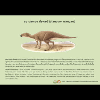 | คำอธิบาย : สยามโมดอน นิ่มงามมิ เป็นไดโนเสาร์ออร์นิโธพอดสกุลใหม่ ชนิดใหม่ของโลกจากประเทศไทย พบกระดูกกรามบนที่ได้มาจากเหมืองหินทราย บ้านสะพานหิน จังหวัดนครราชสีมา อยู่ในหมวดหินโคกกรวด มีอายุช่วงครีเทเชียสตอนกลาง ประมาณ 100 ล้านปีก่อน นอกจากนั้นยังพบฟันและชิ้นส่วนกะโหลกที่เป็นของไดโนเสาร์ชนิดนี้อีกด้วยที่มาของสกุล Siamodon มาจาก Siam ชื่อเดิมของประเทศไทย odoust เป็นภาษากรีกแปลว่าฟัน โดยสะกดเป็น odon เพื่อเน้นความคล้ายคลึงกันกับ Iguanodon ที่มาของชื่อชนิดเพื่อเป็นเกียรติแก่นายวิทยา นิ่มงาม ที่มอบตัวอย่างให้เพื่อการศึกษา |