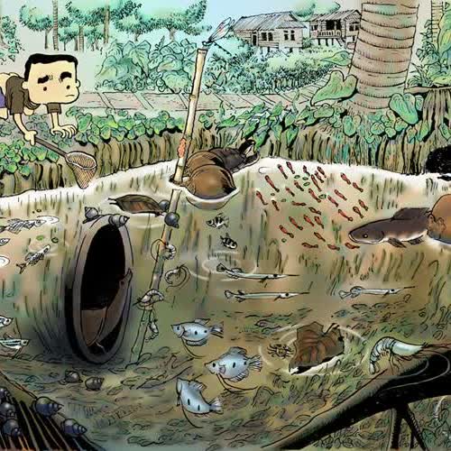 คำอธิบาย : ลำกระโดง ลำประโดง ปากท่อ แล้วแต่ชื่อคนจะเรียก มันเป็นวังน้ำเล็กๆที่มีท่อส่ง คลองบางเขน คลองสาขาจากแม่น้ำเจ้าพระยา ไหลผ่านเรือกสวนของแต่ละบ้านๆมา เมื่อก่อนทุกสวน น้ำจะไหลถึงกันได้หมดถ้านั่งเฝ้ามองได้เงียบจริงๆจะมีตัวละครออกมาแสดงให้ชมได้อย่างมีชีวิตชีวา ดาราประจำก็ได้แก่ หอยขมที่เกาะอยู่ตามทางมะพร้าวที่แช่ในน้ำ หอยโข่งตัวใหญ่ๆ ฝูงปลาซิวที่ว่ายพล่าน และฝูงปลาหัวตะกั่วปลากระดี่ ปลากริมที่รูปร่างเหมือนปลากัดแต่เล็กและบอบบางกว่ามาก ลูกปู กุ้งฝอยตัวเล็กๆมักว่ายอยู่ตามลำไม้ไผ่ที่ปักไว้ที่ปากท่อ ลูกปลาเสือเป้าหมายแรกของการช้อนจับ ปลาเข็มปากยาวๆที่จับง่ายที่สุดเพราะว่ายอยู่ผิวน้ำถ้าโชคดีอาจได้เห็นฝูงลูกคลอกของปลาช่อนฝูงใหญ่ ซึ่งหมายถึงอาจเห็นแม่ปลาช่อนตัวใหญ่เท่าแขน รวมถึงเต่าและตะพาบที่ชอบแอบโผล่มาแบบเงียบๆมหรสพนี้ต้องมีความอดทนและความสงบเป็นตั๋วเข้าชมแต่ปัจจุบันโรงมหรสพนี้ต้องปิดตัวลงเพราะเหล่าบ้านจัดสรรรอบๆได้ถมดินปิดทางน้ำ จนน้ำในสวนเน่าเหม็นเพราะไม่ไหลเวียน.... |