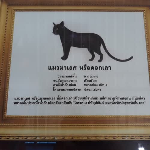 | คำอธิบาย : แมวมาเลศ หรือดอกเลาแมวมาเลศ หรือแมวดอกเลา นี้มีดอกเลาเปรียบเสมือนกับเมฆสีเทายามฟ้าพยับฝน มีนัยน์ตาหยาดเยิ้มประหนึ่งน้ำค้างย้อยต้องกลีบบัว "ใครพบเร่งให้อุปถัมภ์ แมวนั้นจักนำสุขสวัสดิ์มงคล" |