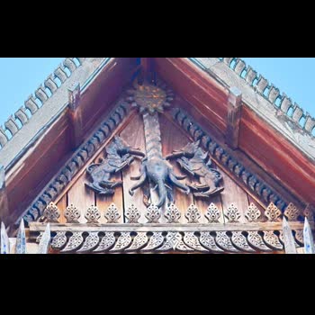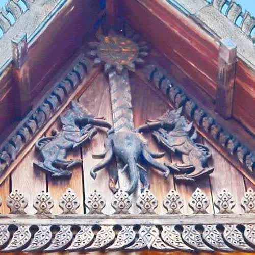 | คำอธิบาย : หน้าบันสิมวัดแจ้ง แกะสลักเป็นรูปช้างเอราวัณอยู่กลางระหว่างคชสีห์สองตัว |