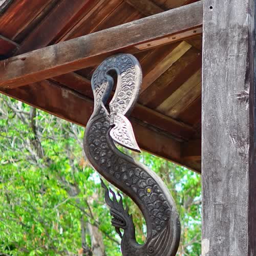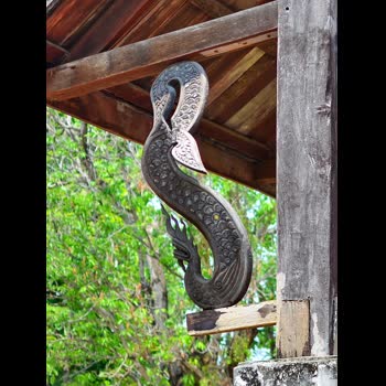 | คำอธิบาย : คันทวยไม้แกะสลัก เป็นงานศิลปกรรมท้องถิ่นที่เป็นเอกลักษณ์ของสิมวัดแจ้ง จังหวัดอุบลราชธานี มีลักษณะเป็นรูปหัวพญานาคมีหงอนสะบัดปลายเป็นกนกเปลว หางหงส์ |