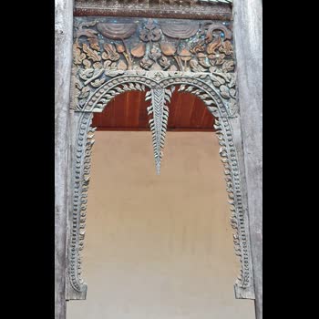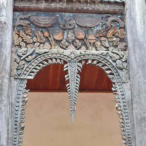 | คำอธิบาย : สิมวัดแจ้ง มีบันไดขึ้นด้านหน้าบันไดเดียว จะมีลายไม้แกะสลักเป็นรูปรวงผึ้งลายดอกบัว อยู่บริเวณทางเข้า |