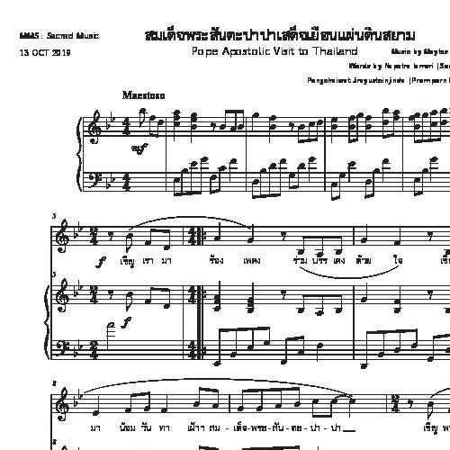 | คำอธิบาย : น้ตเพลงที่ใช้ในพิธีกรรมทางศาสนา ในโอกาสสมเด็จพระสันตะปาปาฟรังซิส ประมุขของศาสนจักรโรมันคาทอลิก เสด็จเยือนประเทศไทย เดือนพฤศจิกายน 2562 ซึ่งนับว่าเป็นประวัติศาสตร์ครั้งสำคัญของประเทศไทย โดยในงานนี้จะเป็นงานที่มีคณะนักขับร้องประสานเสียงที่ใหญ่ที่สุดในประวัติศาสตร์คาทอลิกจำนวนมากถึง 1,000 คน ในชื่อวง “Thai Catholic Choir” อีกทั้งยังเป็นโอกาสครบรอบ 350 ปีมิสซังสยามนับตั้งแต่ที่ศาสนจักรคาทอลิกได้เข้ามาในประเทศไทยอีกด้วยนับเป็นเวลาที่ยาวนานถึง 35 ปี นับตั้งแต่ที่สมเด็จพระสันตะปาปา ยอห์น ปอลที่ 2 ได้เคยเสด็จเยือนประเทศไทยในปี พ.ศ. 2527 |
