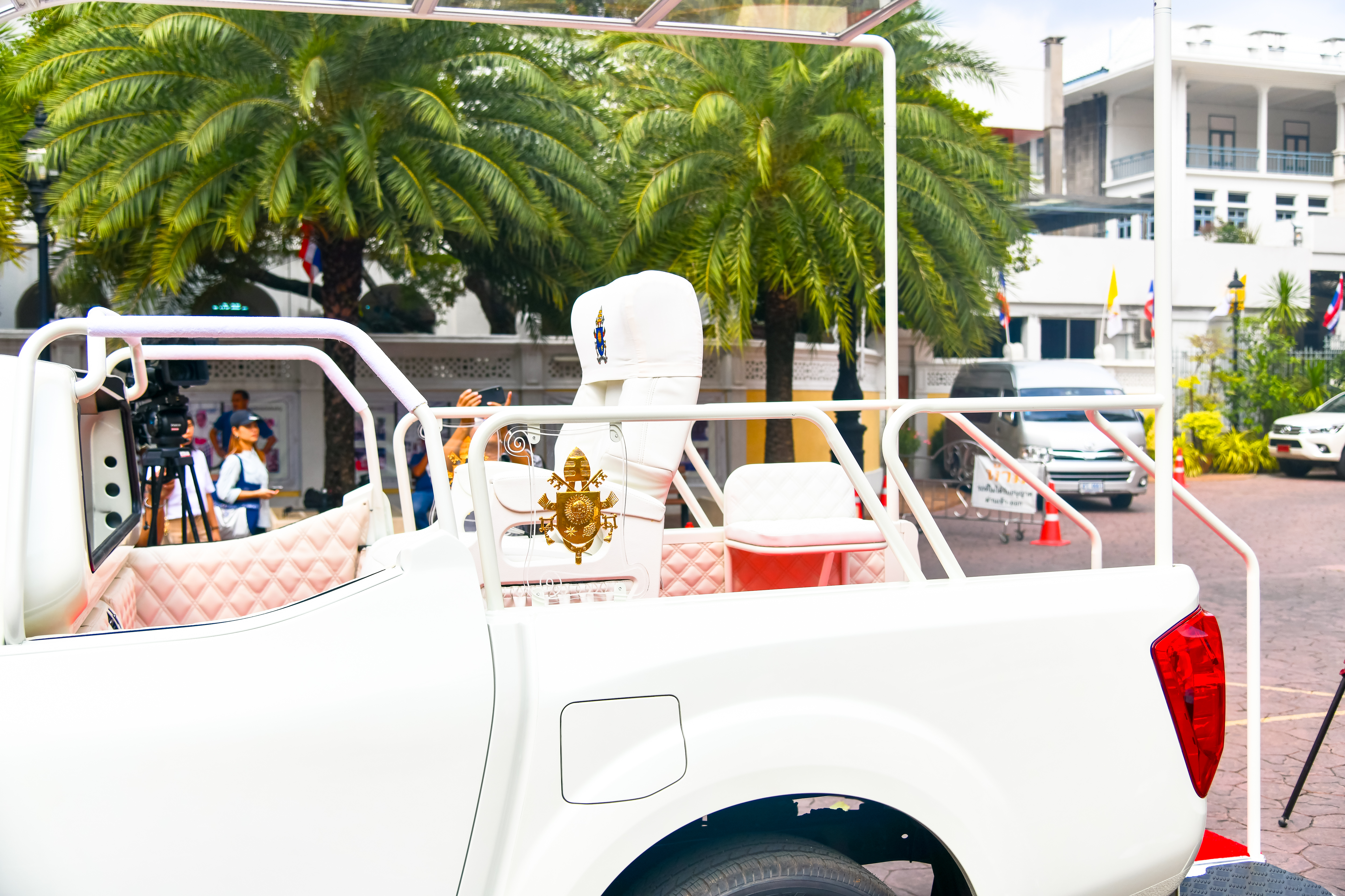 | คำอธิบาย : รถโป๊ปโมบิล (Popemobile) พระพาหนะที่จะนำ สมเด็จพระสันตะปาปาฟรังซิส ไปตามเส้นทางเสด็จเยือนสถานที่ต่างๆ เพื่อพบปะทักทายคริสตศาสนิกชนและชาวไทย ระหว่างการเสด็จเยือนประเทศไทย ระหว่างวันที่ 20-23 พฤศจิกายน ค.ศ.2019 |