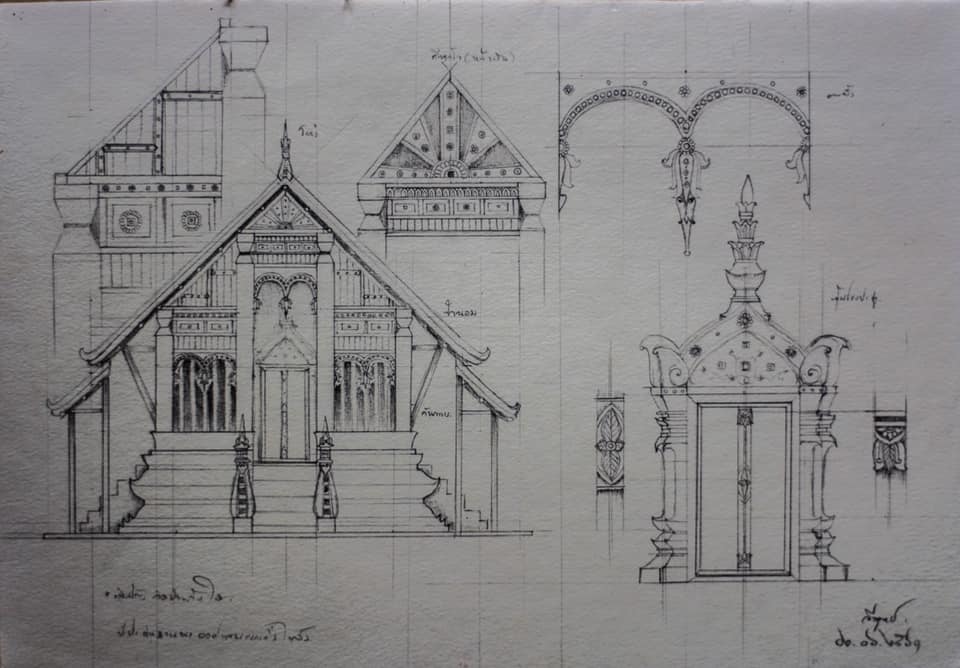 | คำอธิบาย : ภาพลายเส้นเบื้องต้นของสิมวัดวังไฮ บ้านวังไฮ ตำบลคำเตย อำเภอเมือง จังหวัดนครพนม เป็นภาพร่างที่ได้แรงบันดาลใจมาจากรูปแบบสถาปัตยกรรมสิมอีสานแบบพื้นบ้านที่ได้รับอิทธิพลศิลปะลาวล้านช้าง จากการศึกษาลงพื้นที่เก็บข้อมูลจากสถานที่จริงและภาพถ่ายโบราณ จึงนำเอาองค์ประกอบต่างๆ ที่พบมาเรียบเรียงขึ้นมาเป็นสิมหลังใหม่ ก่อนส่งงานต่อให้กับสถาปนิกขยายแบบต่อเป็นแบบ 3 มิติ โดยภาพนี้เป็นภาพลายเส้นเบื้องต้นด้านหน้าของสิม รวมถึงองค์ประกอบอื่นๆ เช่น สีหน้า (หน้าบัน) ฮวงเผิ้ง (รวงผึ้ง) ซุ้มประตู |