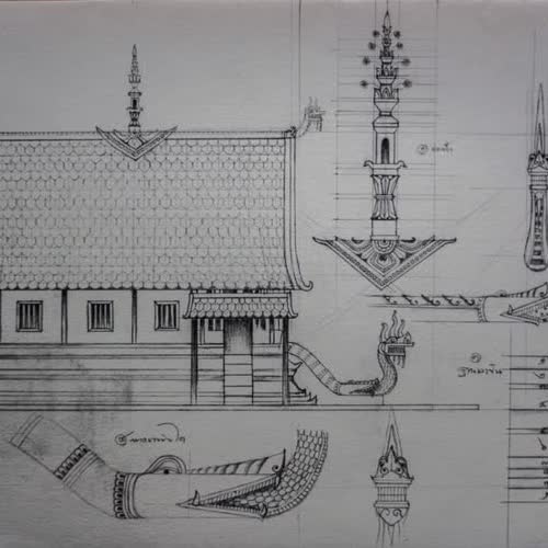 | คำอธิบาย : ภาพลายเส้นเบื้องต้นของสิมวัดวังไฮ บ้านวังไฮ ตำบลคำเตย อำเภอเมือง จังหวัดนครพนม เป็นภาพร่างที่ได้แรงบันดาลใจมาจากรูปแบบสถาปัตยกรรมสิมอีสานแบบพื้นบ้านที่ได้รับอิทธิพลศิลปะลาวล้านช้าง จากการศึกษาลงพื้นที่เก็บข้อมูลจากสถานที่จริงและภาพถ่ายโบราณ จึงนำเอาองค์ประกอบต่างๆ ที่พบมาเรียบเรียงขึ้นมาเป็นสิมหลังใหม่ ก่อนส่งงานต่อให้กับสถาปนิกขยายแบบต่อเป็นแบบ 3 มิติ โดยภาพนี้เป็นภาพลายเส้นเบื้องต้นด้านข้างสิมและองค์ประกอบดังต่อไปนี้ ช่อฟ้า (หอปราสาทกลางหลังคา) นาคราวบันได สัดส่วนแอวขัน และโหง่ (ช่อฟ้าในภาษาภาคกลาง) |