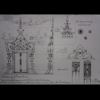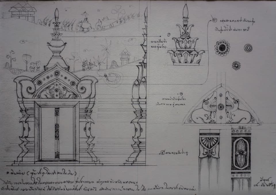 | คำอธิบาย : ภาพลายเส้นเบื้องต้นของสิมวัดวังไฮ บ้านวังไฮ ตำบลคำเตย อำเภอเมือง จังหวัดนครพนม เป็นภาพร่างที่ได้แรงบันดาลใจมาจากรูปแบบสถาปัตยกรรมสิมอีสานแบบพื้นบ้านที่ได้รับอิทธิพลศิลปะลาวล้านช้าง จากการศึกษาลงพื้นที่เก็บข้อมูลจากสถานที่จริงและภาพถ่ายโบราณ จึงนำเอาองค์ประกอบต่างๆ ที่พบมาเรียบเรียงขึ้นมาเป็นสิมหลังใหม่ ก่อนส่งงานต่อให้กับสถาปนิกขยายแบบต่อเป็นแบบ 3 มิติ โดยภาพนี้คือ ภาพร่างซุ้มประตูเข้าสิมพร้อมลวดลายปูนปั้นที่จะประดับประดา |