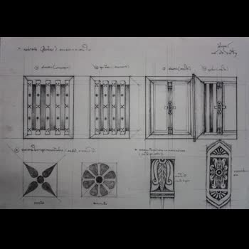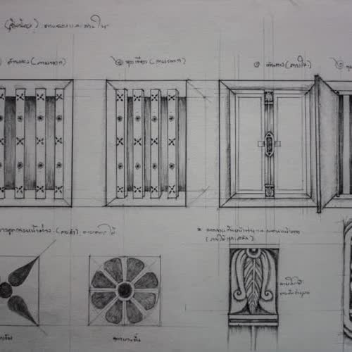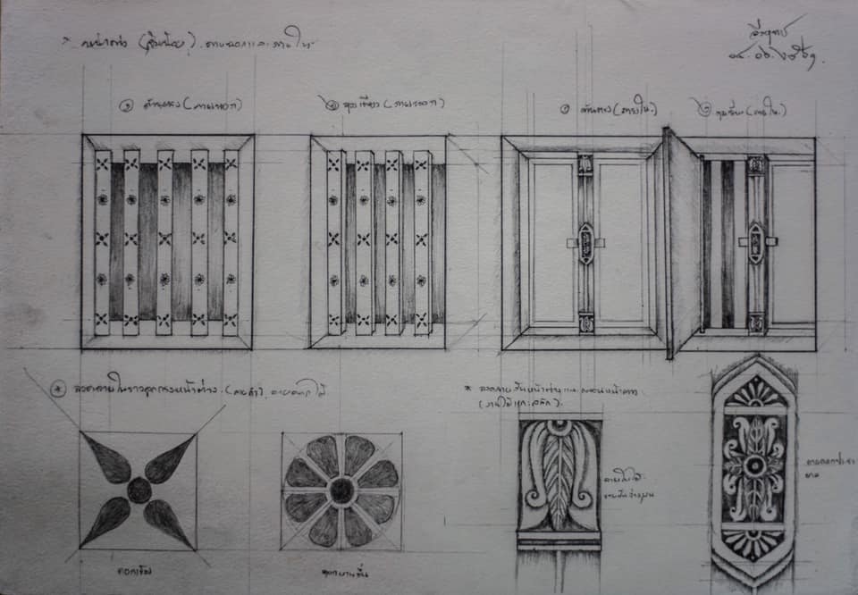 | คำอธิบาย : ภาพลายเส้นเบื้องต้นของสิมวัดวังไฮ บ้านวังไฮ ตำบลคำเตย อำเภอเมือง จังหวัดนครพนม เป็นภาพร่างที่ได้แรงบันดาลใจมาจากรูปแบบสถาปัตยกรรมสิมอีสานแบบพื้นบ้านที่ได้รับอิทธิพลศิลปะลาวล้านช้าง จากการศึกษาลงพื้นที่เก็บข้อมูลจากสถานที่จริงและภาพถ่ายโบราณ จึงนำเอาองค์ประกอบต่างๆ ที่พบมาเรียบเรียงขึ้นมาเป็นสิมหลังใหม่ ก่อนส่งงานต่อให้กับสถาปนิกขยายแบบต่อเป็นแบบ 3 มิติ โดยภาพนี้คือ ภาพร่างช่องหน้าต่างและหน้าต่างสิม |