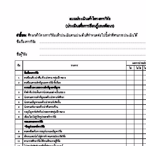 | ชื่อเรื่อง : แบบประเมินเค้าโครงการวิจัย (ประเมินเพื่อการเรียนรู้และพัฒนา) |