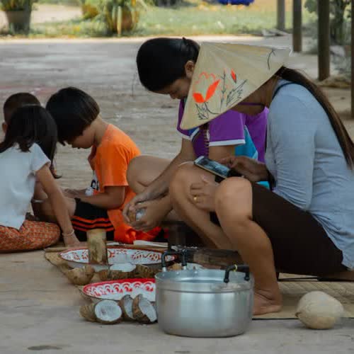 | คำอธิบาย : การเตรียมวัตถุดิบในการทำขนม ในพิธีวางศิลาฤกษ์ หรือ พิธีวางหลักศิลาเลข (ภาษาพื้นถิ่น) สิมวัดวังไฮ จัดขึ้นเมื่อวันที่ 13 เมษายน 2562 คือพิธีที่ถือเป็นฤกษ์งามยามดีในการเริ่มต้นในการก่อสร้างสิม ซึ่งงานพิธีในครั้งนี้จัดพิธีในรูปแบบพื้นบ้านชาวบ้านวังไฮ อันประกอบไปด้วยการจัดเตรียมเครื่องบวงสรวงสักการะตลอดจนจัดเตรียมสถานที่ ที่สะท้อนถึงภูมิปัญญาในด้านต่างๆ อาทิเช่น ภูมิปัญญาในด้านการทำเครื่องสักการะ ภูมิปัญญาการจักสาน ภูมิปัญญาการถักทอ ภูมิปัญญาในการปั้นปูน ภูมิปัญญาในการทำขนม และการใช้สอยทรัพยากรในท้องถิ่นอื่นๆ อีกมากมาย อันสอดคล้องกับวิถีชีวิตความเป็นอยู่ของผู้คนในชนบทอีสาน |