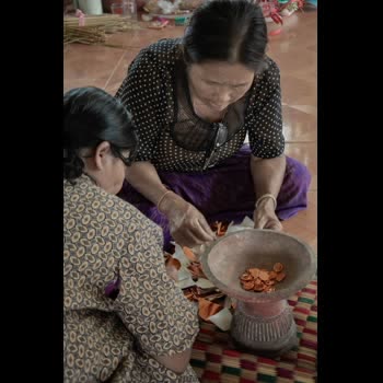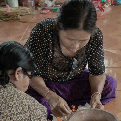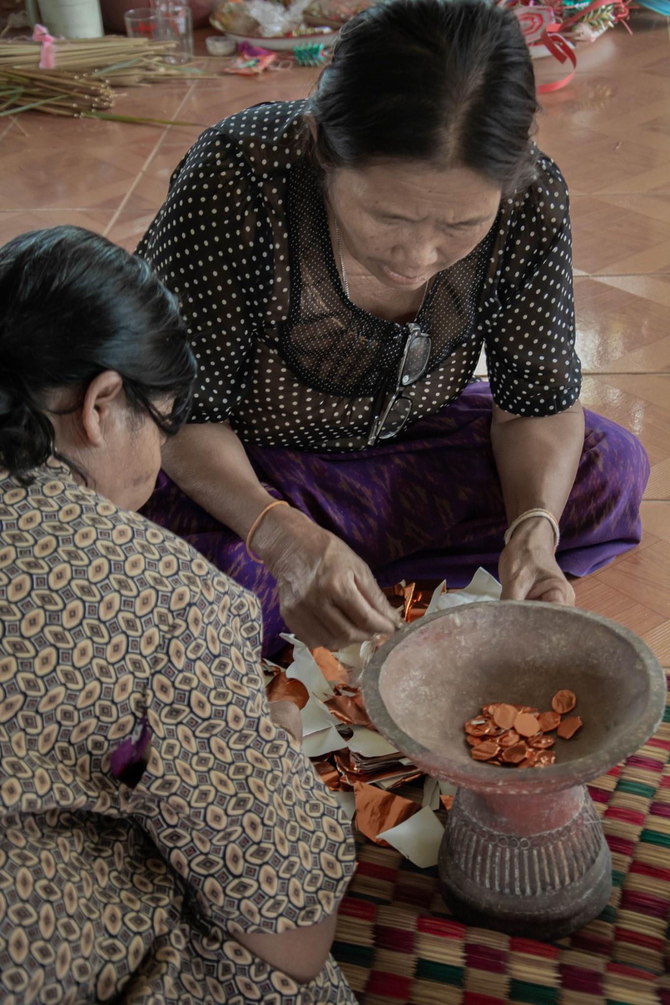 | คำอธิบาย : การห่อเหรียญโปรยทานในพิธีวางศิลาฤกษ์ หรือ พิธีวางหลักศิลาเลข (ภาษาพื้นถิ่น) สิมวัดวังไฮ จัดขึ้นเมื่อวันที่ 13 เมษายน 2562 คือพิธีที่ถือเป็นฤกษ์งามยามดีในการเริ่มต้นในการก่อสร้างสิม ซึ่งงานพิธีในครั้งนี้จัดพิธีในรูปแบบพื้นบ้านชาวบ้านวังไฮ อันประกอบไปด้วยการจัดเตรียมเครื่องบวงสรวงสักการะตลอดจนจัดเตรียมสถานที่ ที่สะท้อนถึงภูมิปัญญาในด้านต่างๆ อาทิเช่น ภูมิปัญญาในด้านการทำเครื่องสักการะ ภูมิปัญญาการจักสาน ภูมิปัญญาการถักทอ ภูมิปัญญาในการปั้นปูน ภูมิปัญญาในการทำขนม และการใช้สอยทรัพยากรในท้องถิ่นอื่นๆ อีกมากมาย อันสอดคล้องกับวิถีชีวิตความเป็นอยู่ของผู้คนในชนบทอีสาน |