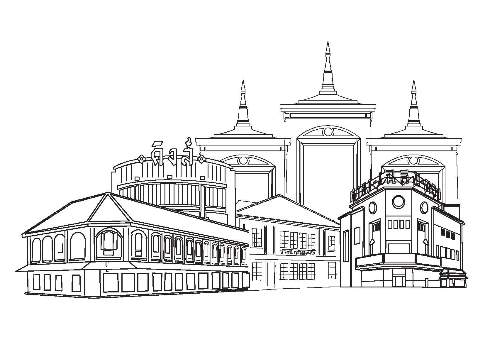 Clip art ภาพวาดลายเส้นกลุ่มอาคารในย่านสามยอด-พาหุรัด-วังบูรพา