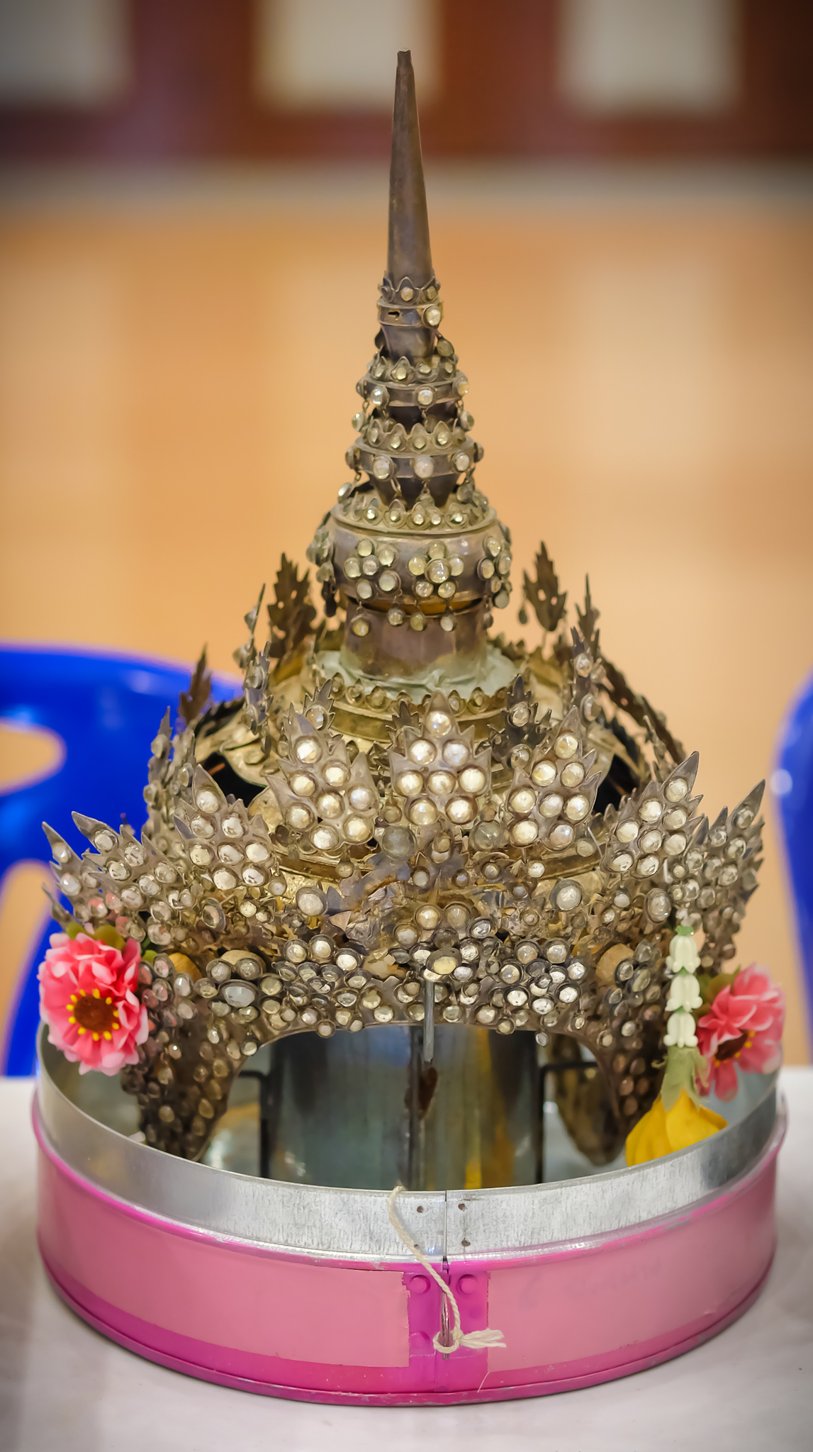 | คำอธิบาย : ปันจุเหร็จยอด หรือ บัณฑจุเร็จ เครื่องประกอบศรีษะ ใช้ในความหมายแทนผ้าโพก ใช้กับตัวพระ ทำด้วยเงินทั้งอัน |