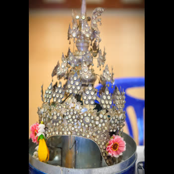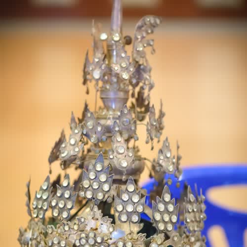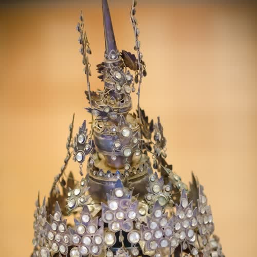 | คำอธิบาย : ปันจุเหร็จยอด หรือ บัณฑจุเร็จ เครื่องประกอบศรีษะ ใช้ในความหมายแทนผ้าโพก ใช้กับตัวพระ ทำด้วยเงินทั้งอัน |
