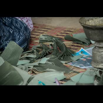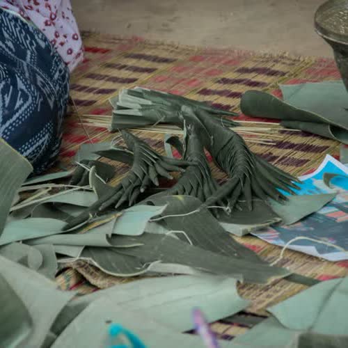 | คำอธิบาย : กลีบใบตองที่เตรียมไว้ประกอบเป็นเครื่องบวงสรวง ในในพิธีวางศิลาฤกษ์ หรือ พิธีวางหลักศิลาเลข (ภาษาพื้นถิ่น) สิมวัดวังไฮ จัดขึ้นเมื่อวันที่ 13 เมษายน 2562 คือพิธีที่ถือเป็นฤกษ์งามยามดีในการเริ่มต้นในการก่อสร้างสิม ซึ่งงานพิธีในครั้งนี้จัดพิธีในรูปแบบพื้นบ้านชาวบ้านวังไฮ อันประกอบไปด้วยการจัดเตรียมเครื่องบวงสรวงสักการะตลอดจนจัดเตรียมสถานที่ ที่สะท้อนถึงภูมิปัญญาในด้านต่างๆ อาทิเช่น ภูมิปัญญาในด้านการทำเครื่องสักการะ ภูมิปัญญาการจักสาน ภูมิปัญญาการถักทอ ภูมิปัญญาในการปั้นปูน ภูมิปัญญาในการทำขนม และการใช้สอยทรัพยากรในท้องถิ่นอื่นๆ อีกมากมาย อันสอดคล้องกับวิถีชีวิตความเป็นอยู่ของผู้คนในชนบทอีสาน |