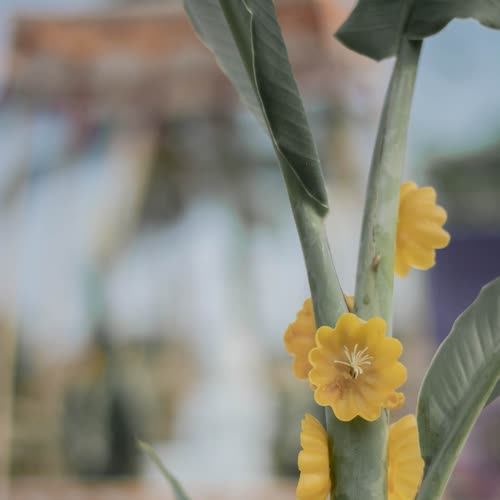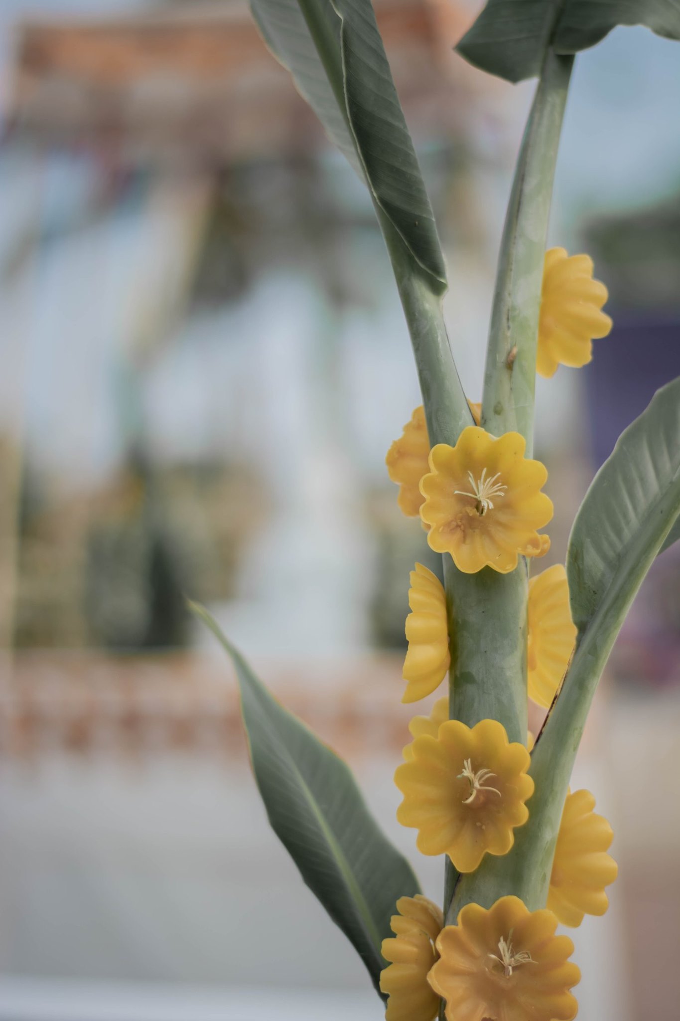 | คำอธิบาย : ต้นผึ้ง หนึ่งในเครื่องสักการะโบราณของชาวอีสาน ในพิธีวางศิลาฤกษ์ หรือ พิธีวางหลักศิลาเลข (ภาษาพื้นถิ่น) สิมวัดวังไฮ จัดขึ้นเมื่อวันที่ 13 เมษายน 2562 คือพิธีที่ถือเป็นฤกษ์งามยามดีในการเริ่มต้นในการก่อสร้างสิม ซึ่งงานพิธีในครั้งนี้จัดพิธีในรูปแบบพื้นบ้านชาวบ้านวังไฮ อันประกอบไปด้วยการจัดเตรียมเครื่องบวงสรวงสักการะตลอดจนจัดเตรียมสถานที่ ที่สะท้อนถึงภูมิปัญญาในด้านต่างๆ อาทิเช่น ภูมิปัญญาในด้านการทำเครื่องสักการะ ภูมิปัญญาการจักสาน ภูมิปัญญาการถักทอ ภูมิปัญญาในการปั้นปูน ภูมิปัญญาในการทำขนม และการใช้สอยทรัพยากรในท้องถิ่นอื่นๆ อีกมากมาย อันสอดคล้องกับวิถีชีวิตความเป็นอยู่ของผู้คนในชนบทอีสาน |