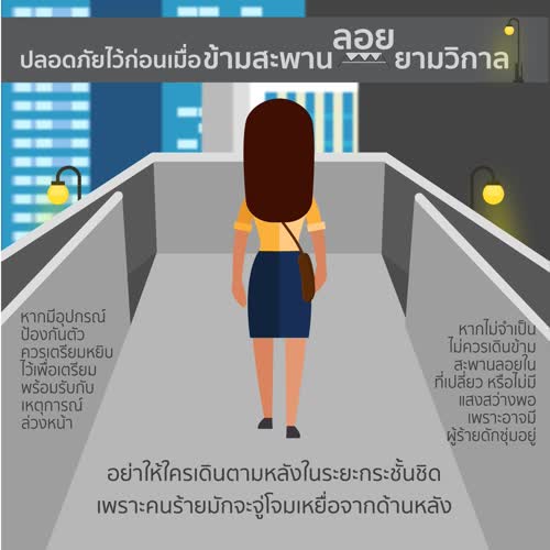 | คำสำคัญ : ป้องกันตัว, ยามวิกาล, สะพานลอย, ข้ามสะพานลอย, Infographic, ข้อควรระวัง, อินโฟกราฟิก, เลี่ยงอันตราย, การข้ามสะพานลอยยานวิกาล |