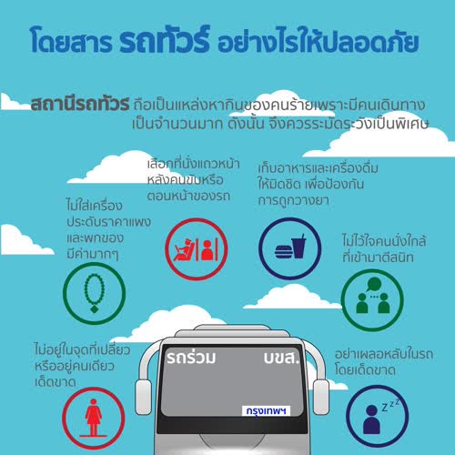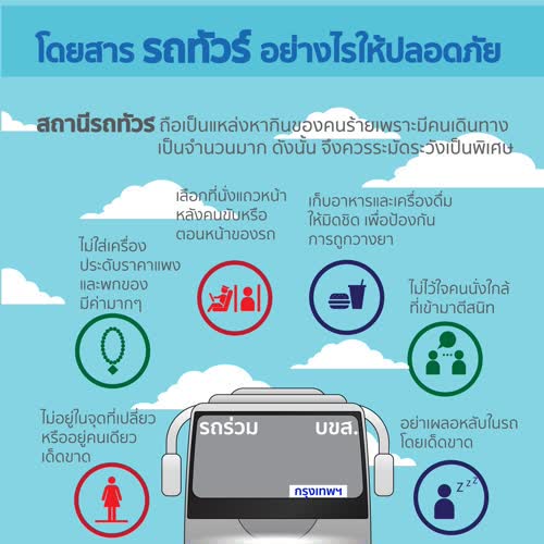 Infographic การเตือนภัยอาชญากรรม เรื่อง โดยสารรถทัวร์ให้ปลอดภัย ได้รับใบอนุญาตภายใต้ ให้เผยแพร่-โดยต้องระบุที่มาแต่ห้ามดัดแปลงและห้ามใช้เพื่อการค้า 3.0 Thailand.
