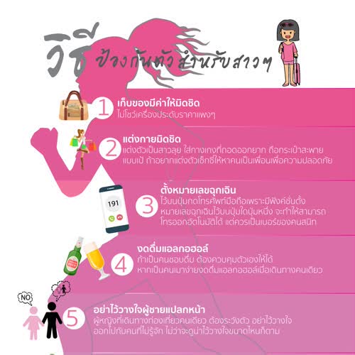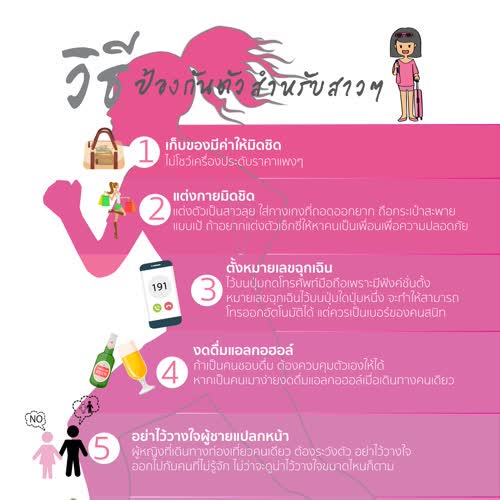 (2563). "Infographic การเตือนภัยอาชญากรรม เรื่อง วิธีป้องกันตัวสำหรับผู้หญิง".