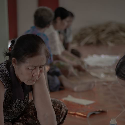 | คำอธิบาย : การตัดกระดาษทองประดับบนผืนผ้า ในพิธีวางศิลาฤกษ์ หรือ พิธีวางหลักศิลาเลข (ภาษาพื้นถิ่น) สิมวัดวังไฮ จัดขึ้นเมื่อวันที่ 13 เมษายน 2562 คือพิธีที่ถือเป็นฤกษ์งามยามดีในการเริ่มต้นในการก่อสร้างสิม ซึ่งงานพิธีในครั้งนี้จัดพิธีในรูปแบบพื้นบ้านชาวบ้านวังไฮ อันประกอบไปด้วยการจัดเตรียมเครื่องบวงสรวงสักการะตลอดจนจัดเตรียมสถานที่ ที่สะท้อนถึงภูมิปัญญาในด้านต่างๆ อาทิเช่น ภูมิปัญญาในด้านการทำเครื่องสักการะ ภูมิปัญญาการจักสาน ภูมิปัญญาการถักทอ ภูมิปัญญาในการปั้นปูน ภูมิปัญญาในการทำขนม และการใช้สอยทรัพยากรในท้องถิ่นอื่นๆ อีกมากมาย อันสอดคล้องกับวิถีชีวิตความเป็นอยู่ของผู้คนในชนบทอีสาน |