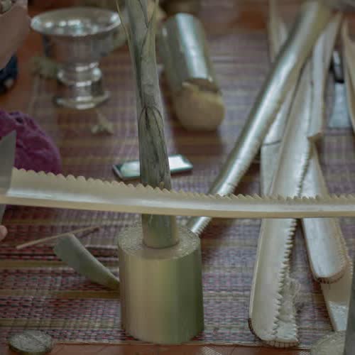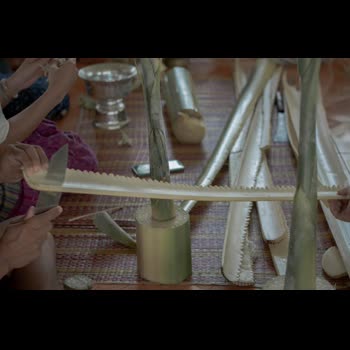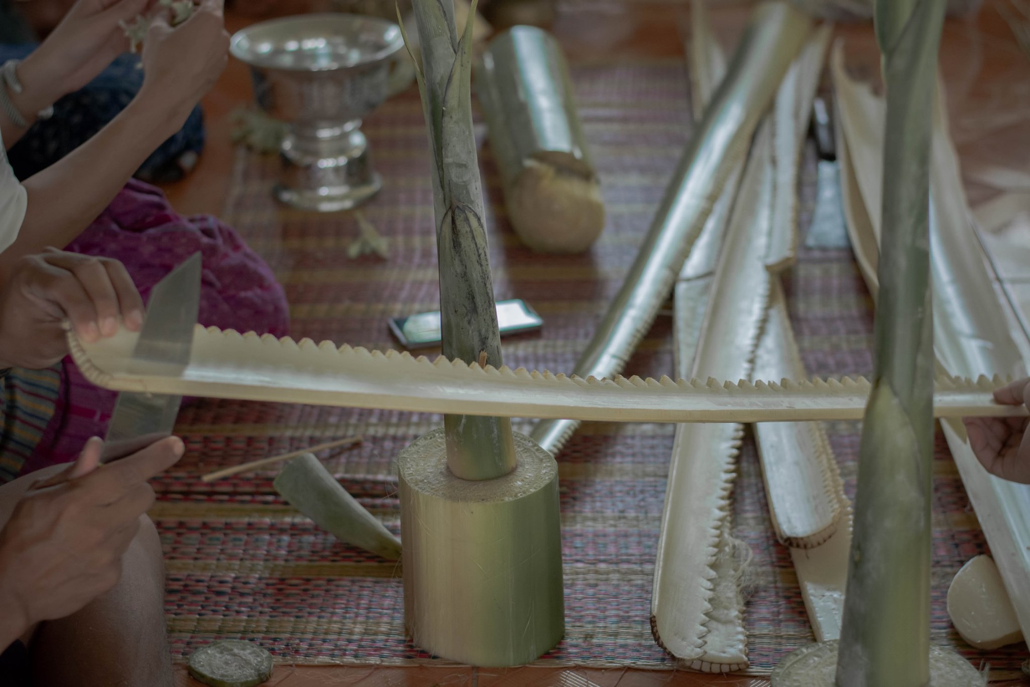 | คำอธิบาย : การทำต้นผึ้ง ในพิธีวางศิลาฤกษ์ หรือ พิธีวางหลักศิลาเลข (ภาษาพื้นถิ่น) สิมวัดวังไฮ จัดขึ้นเมื่อวันที่ 13 เมษายน 2562 คือพิธีที่ถือเป็นฤกษ์งามยามดีในการเริ่มต้นในการก่อสร้างสิม ซึ่งงานพิธีในครั้งนี้จัดพิธีในรูปแบบพื้นบ้านชาวบ้านวังไฮ อันประกอบไปด้วยการจัดเตรียมเครื่องบวงสรวงสักการะตลอดจนจัดเตรียมสถานที่ ที่สะท้อนถึงภูมิปัญญาในด้านต่างๆ อาทิเช่น ภูมิปัญญาในด้านการทำเครื่องสักการะ ภูมิปัญญาการจักสาน ภูมิปัญญาการถักทอ ภูมิปัญญาในการปั้นปูน ภูมิปัญญาในการทำขนม และการใช้สอยทรัพยากรในท้องถิ่นอื่นๆ อีกมากมาย อันสอดคล้องกับวิถีชีวิตความเป็นอยู่ของผู้คนในชนบทอีสาน |