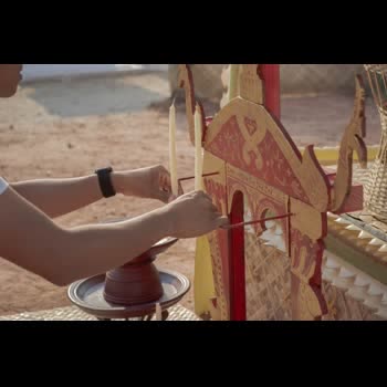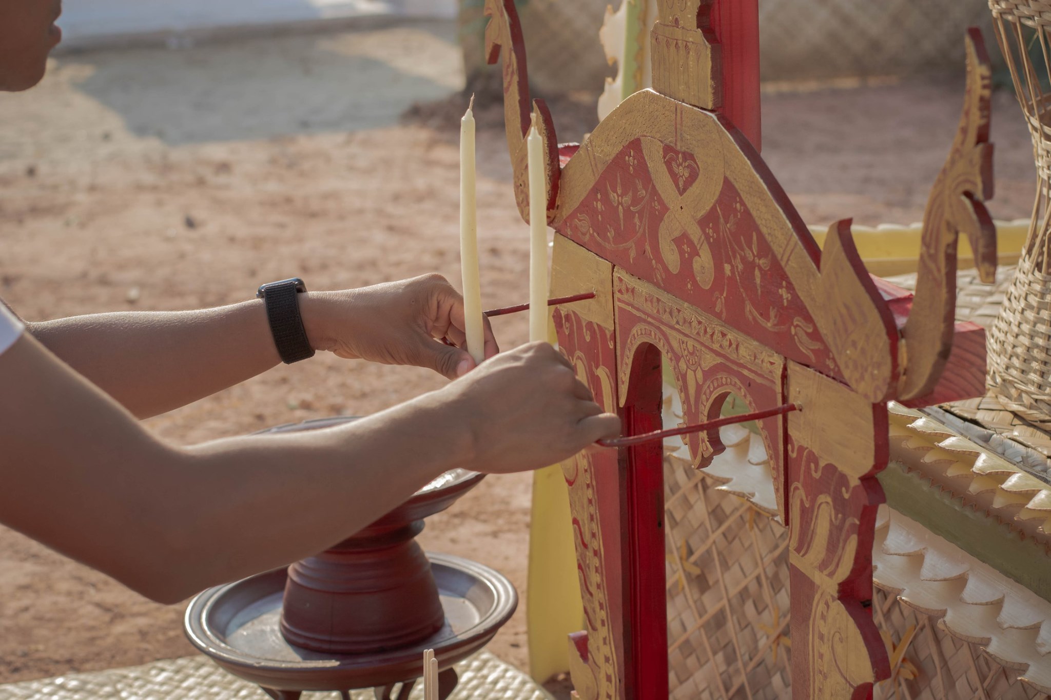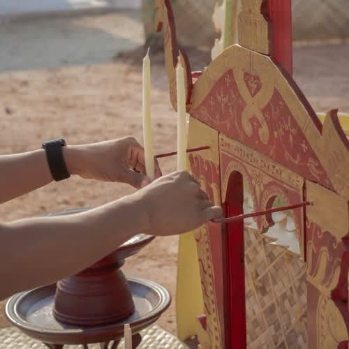 | คำอธิบาย : การติดตั้งเทียนบนฮาวเทียนหรือราวเทียนในพิธีวางศิลาฤกษ์ หรือ พิธีวางหลักศิลาเลข (ภาษาพื้นถิ่น) สิมวัดวังไฮ จัดขึ้นเมื่อวันที่ 13 เมษายน 2562 คือพิธีที่ถือเป็นฤกษ์งามยามดีในการเริ่มต้นในการก่อสร้างสิม ซึ่งงานพิธีในครั้งนี้จัดพิธีในรูปแบบพื้นบ้านชาวบ้านวังไฮ อันประกอบไปด้วยการจัดเตรียมเครื่องบวงสรวงสักการะตลอดจนจัดเตรียมสถานที่ ที่สะท้อนถึงภูมิปัญญาในด้านต่างๆ อาทิเช่น ภูมิปัญญาในด้านการทำเครื่องสักการะ ภูมิปัญญาการจักสาน ภูมิปัญญาการถักทอ ภูมิปัญญาในการปั้นปูน ภูมิปัญญาในการทำขนม และการใช้สอยทรัพยากรในท้องถิ่นอื่นๆ อีกมากมาย อันสอดคล้องกับวิถีชีวิตความเป็นอยู่ของผู้คนในชนบทอีสาน |