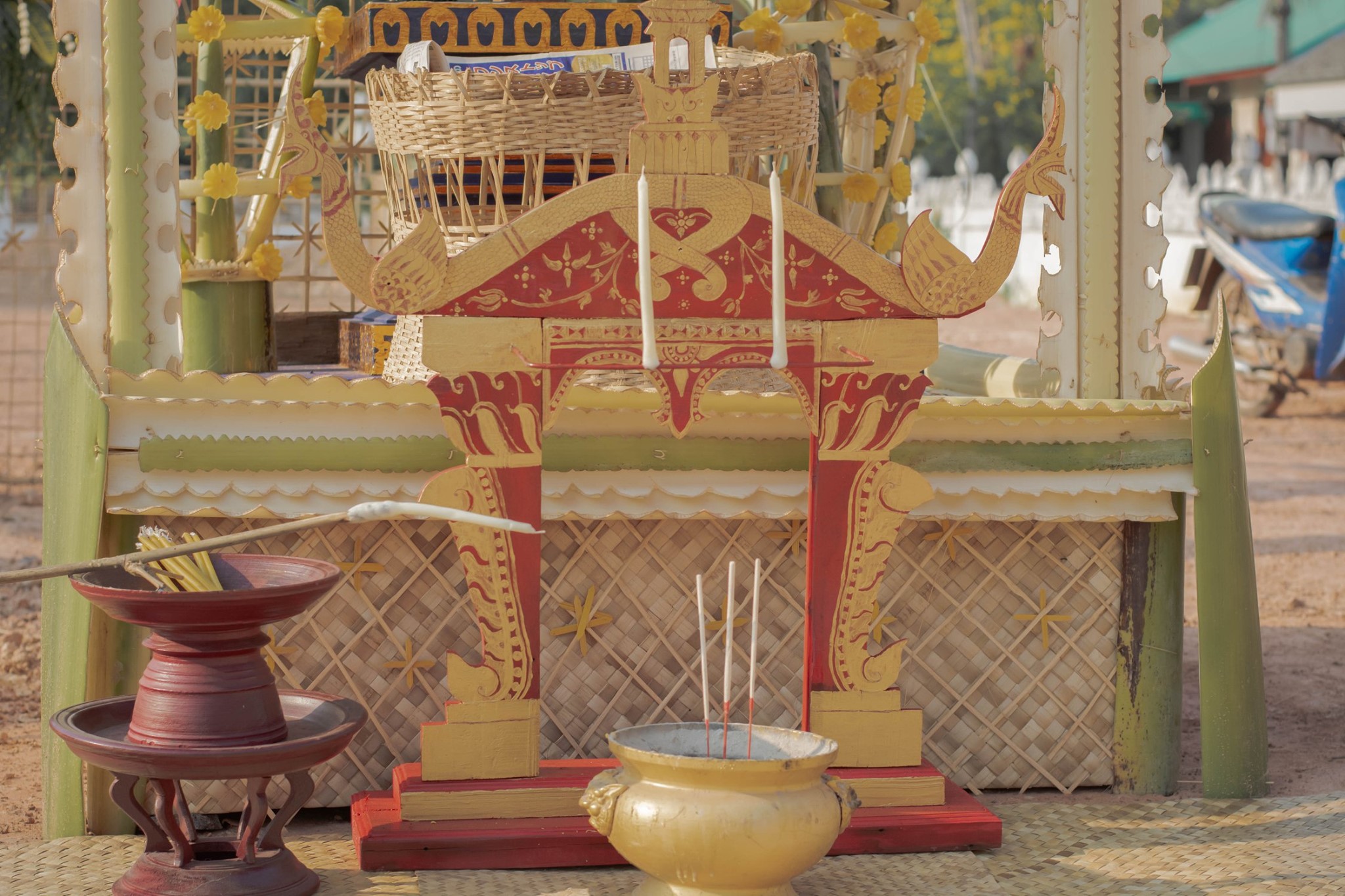 | คำอธิบาย : การจัดธูปเทียนบูชาพระในพิธีวางศิลาฤกษ์ หรือ พิธีวางหลักศิลาเลข (ภาษาพื้นถิ่น) สิมวัดวังไฮ จัดขึ้นเมื่อวันที่ 13 เมษายน 2562 คือพิธีที่ถือเป็นฤกษ์งามยามดีในการเริ่มต้นในการก่อสร้างสิม ซึ่งงานพิธีในครั้งนี้จัดพิธีในรูปแบบพื้นบ้านชาวบ้านวังไฮ อันประกอบไปด้วยการจัดเตรียมเครื่องบวงสรวงสักการะตลอดจนจัดเตรียมสถานที่ ที่สะท้อนถึงภูมิปัญญาในด้านต่างๆ อาทิเช่น ภูมิปัญญาในด้านการทำเครื่องสักการะ ภูมิปัญญาการจักสาน ภูมิปัญญาการถักทอ ภูมิปัญญาในการปั้นปูน ภูมิปัญญาในการทำขนม และการใช้สอยทรัพยากรในท้องถิ่นอื่นๆ อีกมากมาย อันสอดคล้องกับวิถีชีวิตความเป็นอยู่ของผู้คนในชนบทอีสาน |