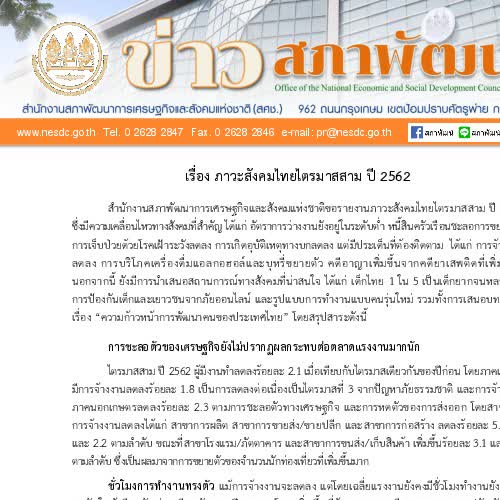 | คำสำคัญ : การพัฒนา, ภาวะสังคม, ข่าวสภาพัฒน์, ประเทศไทย |