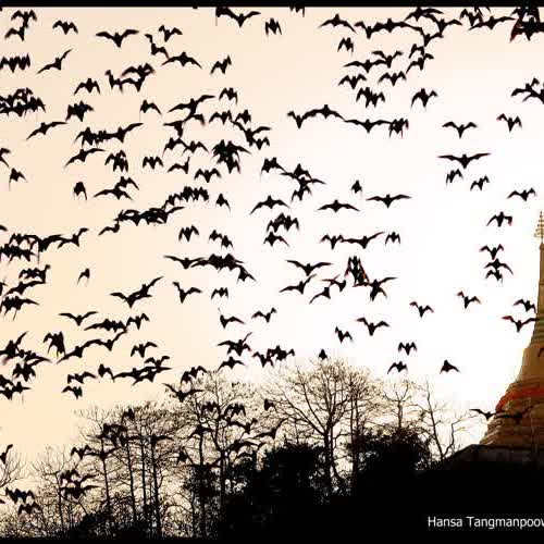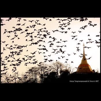 | คำอธิบาย : ภาพอันน่าประทับใจของฝูงค้างคาว ณ เขาช่องพราน ที่บินออกหากินในช่วงใกล้พลบค่ำ นับเป็นครั้งแรกที่ผมได้เห็นภาพอันน่าตื่นตาตื่นใจกับค้างคาวนับหมื่นนับแสนตัว ที่โผบินออกจากถ้ำเขาช่องพราน เพื่อกระจายกันออกหากิน ซึ่งแสดงให้เห็นว่า ในแถบนั้นคงมีแหล่งอาหารที่ยังคงอุดมสมบูรณ์อยู่มาก ที่ทำให้พวกมันสามารถดำรงชีวิตสืบเผ่าพันธุ์มาได้อย่างยาวนาน |