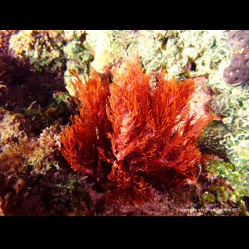 | คำอธิบาย : ภาพถ่ายใต้น้ำของสาหร่ายทะเลสีแดงในสกุล Halymenia durvillei Bory ที่พบขึ้นอยู่ทั่วไปบริเวณโขดหินใต้น้ำในแนวหาดหินชายฝั่งของแหลมคอกวาง เกาะลันตาใหญ่ ด้วยสีสันที่สดใสและลำต้นที่พลิ้วไหวเมื่อยามต้องคลื่นทำให้ดูราวกับว่าสาหร่ายชนิดนี้เป็นเปลวไฟที่กำลังลุกไหม้อยู่ใต้น้ำมองดูสวยงามมาก |