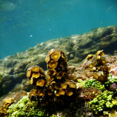 | คำอธิบาย : ภาพถ่ายใต้น้ำของสาหร่ายทะเลสองชนิดที่พบอยู่ด้วยกันบนโขดหินใต้น้ำในแนวหาดหินชายฝั่งของแหลมคอกวาง เกาะลันตาใหญ่ ที่มีกระแสน้ำค่อนข้างแรง ซึ่งทั้งสองต่างก็มีการปรับตัวเพื่อให้สามารถอยู่ณ.ที่ตรงนั้นได้ สังเกตจากการที่ทั้งสองชนิดมีลำต้นที่สั้นมากเมื่อเทียบกับพวกที่ขึ้นในที่น้ำนิ่งกว่า แม้ต่างสีต่างชนิดแต่มีเป้าหมายเดียวกันเพื่อความอยู่รอด |