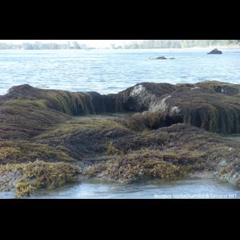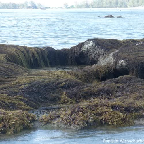 | คำอธิบาย : ภาพของสาหร่ายสีน้ำตาลชนิด Sargassum sp.เป็นสาหร่ายกลุ่มสีน้ำตาล เมื่อโตเต็มที่อาจจะมีความยาวได้มากถึงหลายเมตร จากภาพ เมื่อน้ำลงจะสังเกตเห็นว่า ต้นใหญ่โตอยู่กันเป็นกอ สามารถขึ้นคลุมหินขนาดใหญ่ได้เลย |