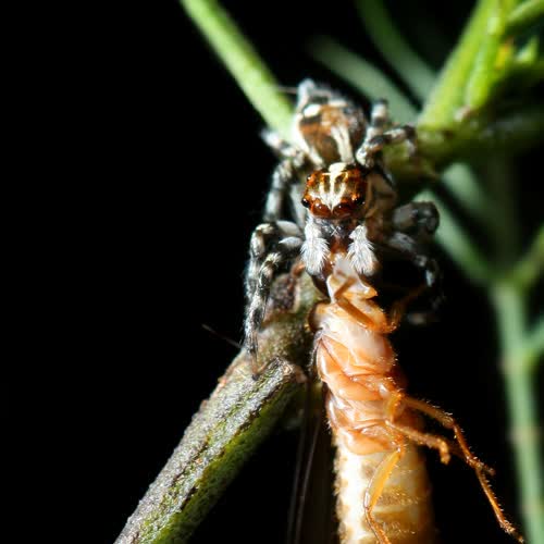| คำอธิบาย : หลังฝนตกครั้งใหญ่ ฝูงแมงเม่าบินกันออกมาจากรังปลวกเพื่อสืบทอดเผ่าพันธุ์ แต่เวลานี้ถือเป็นช่วงอันตรายที่สุดของพวกมัน เพราะนอกรังปลวก นักล่ามากมายกำลังเฝ้ารอเหยื่อที่จะเป็นอาหารของมัน แมงเม่าตัวนี้ตกเป็นอาหารของแมงมุมกระโดดตัวหนึ่งที่ดักรออยู่บนยอดไม้ แม้ไม่สามารถทำหน้าที่ได้สำเร็จ แต่มันก็สืบทอดพลังงานไปสู่ชีวิตอื่น |