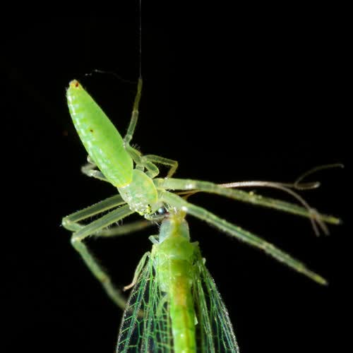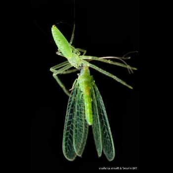 | คำอธิบาย : แมงมุมปูเขียว (Oxytate sp) ตัวจิ๋ว กำลังดูดกินแมงช้างปีกใส ภาพการกินเหยื่อของนักล่าประเภทนี้มักไม่ค่อยได้เห็นบ่อยนัก เพราะมันมีขนาดเล็กและยังเป็นเวลากลางคืนที่มองหาได้ยากอีกด้วย เป็นครั้งแรกที่ผมเห็นว่าหลังจากจับเหยื่อได้แล้ว มันห้อยตัวลงมากินกลางอากาศ |